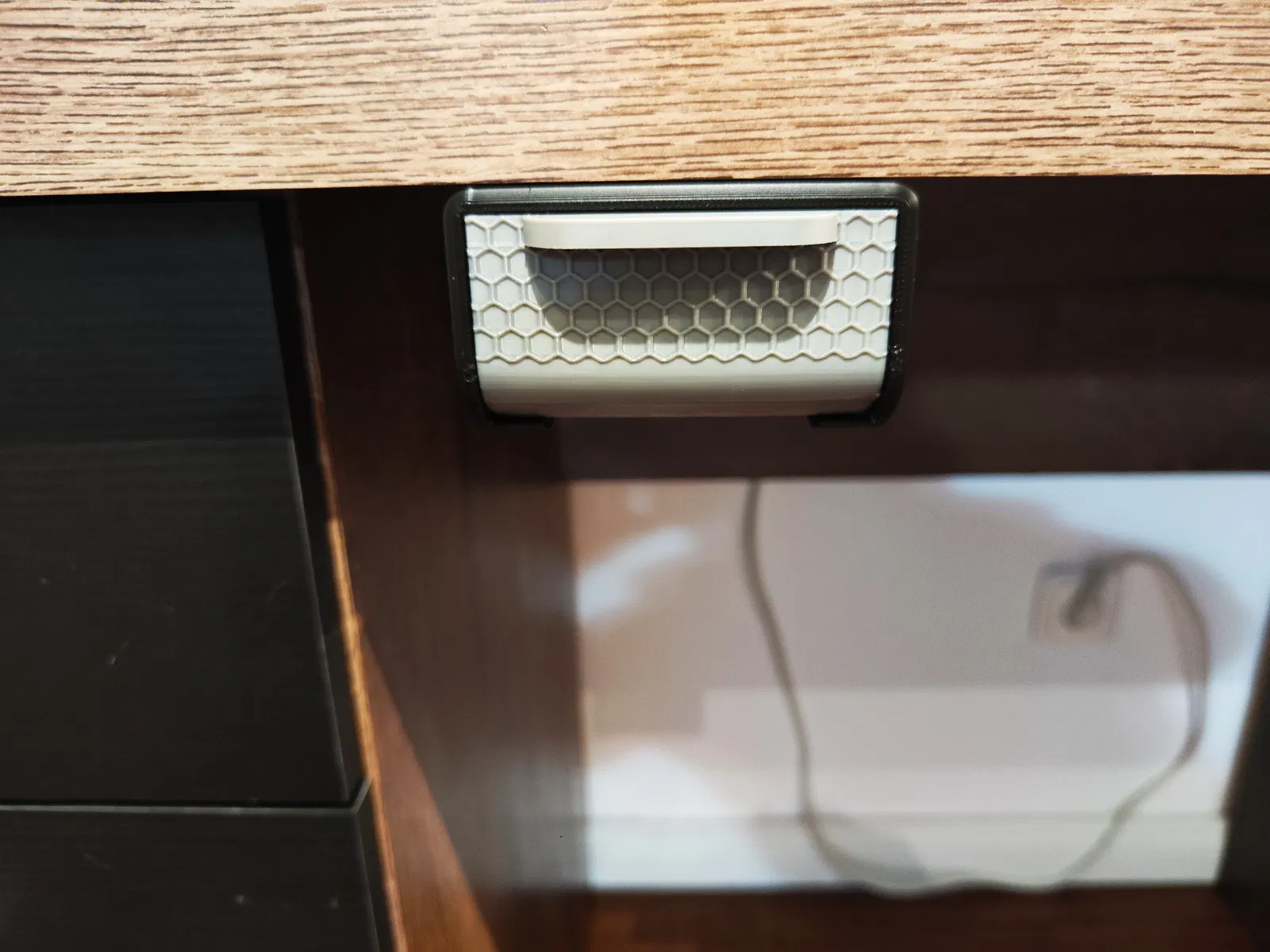 Mình chỉ dán nó dưới mặt bàn bằng băng keo hai mặt thôi. Bám rất chắc.