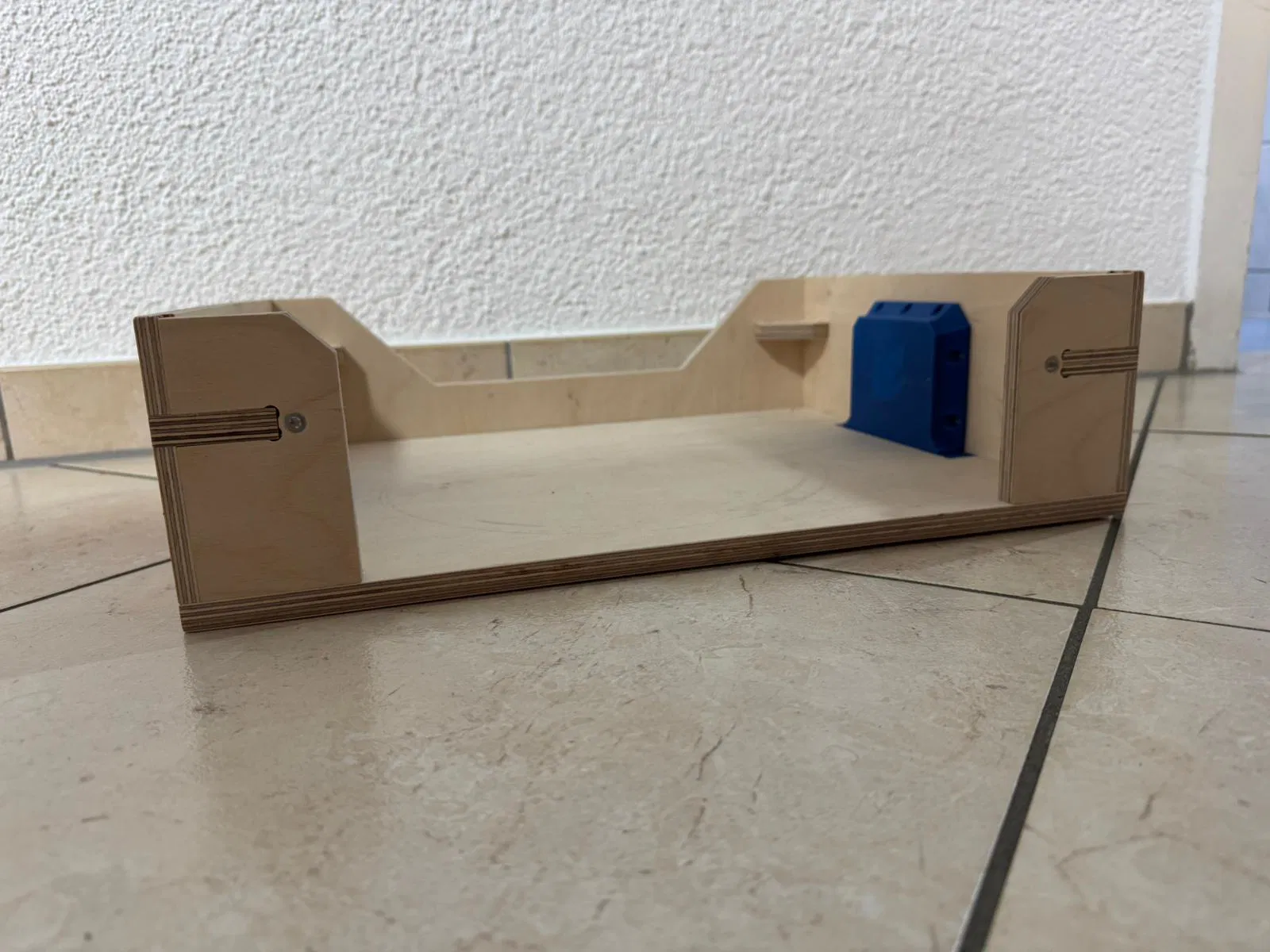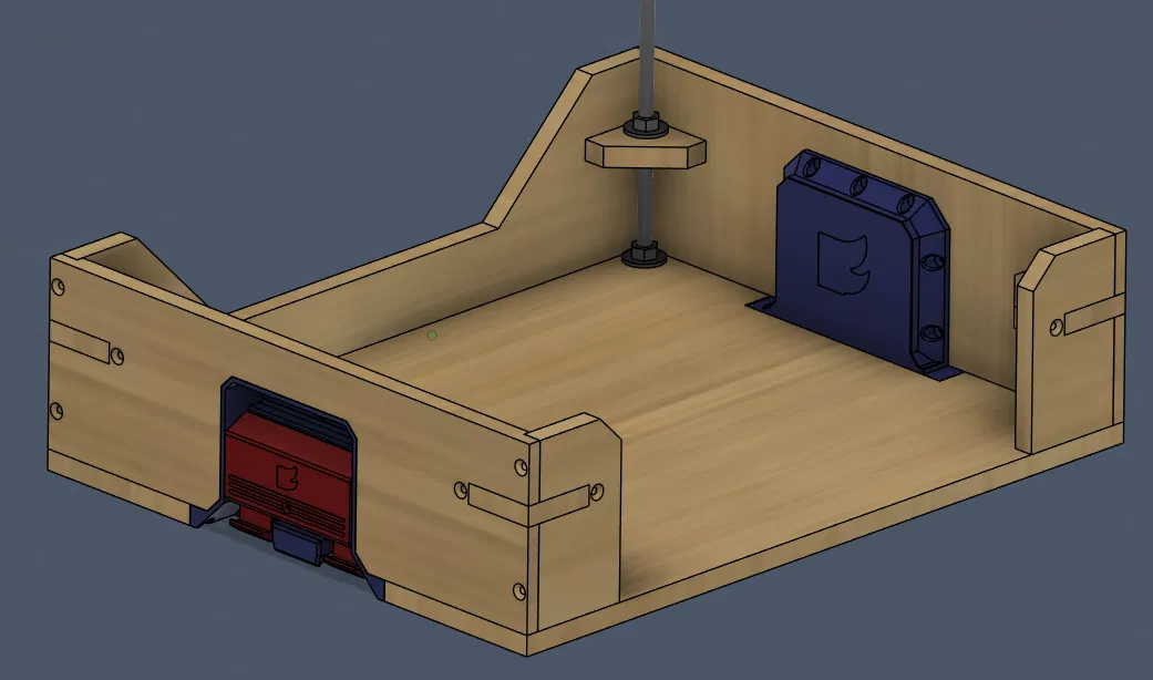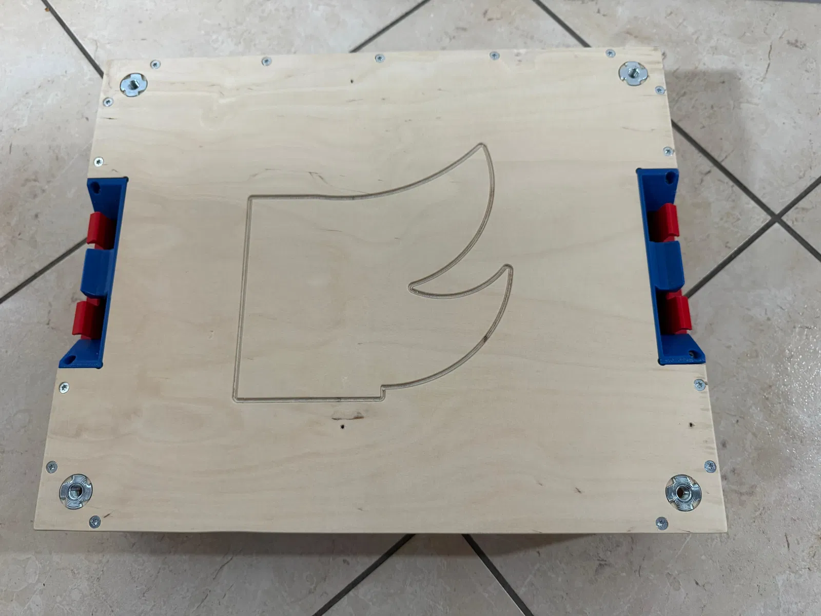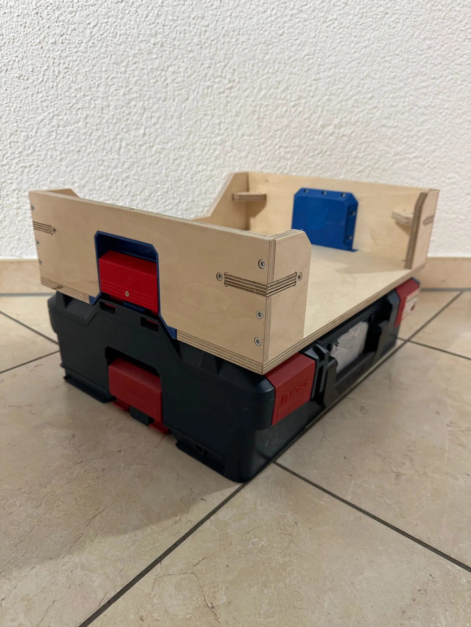 Bản L-BOXX_Modified_Grip là adapter được chỉnh sửa cho cứng cáp hơn, thêm một hộp chứa M8 nuts để vẫn chỉnh được linh hoạt. Mẫu dùng ván Birch Multiplex 12mm; vỏ xanh in PETG, tay nắm đỏ in ASA.