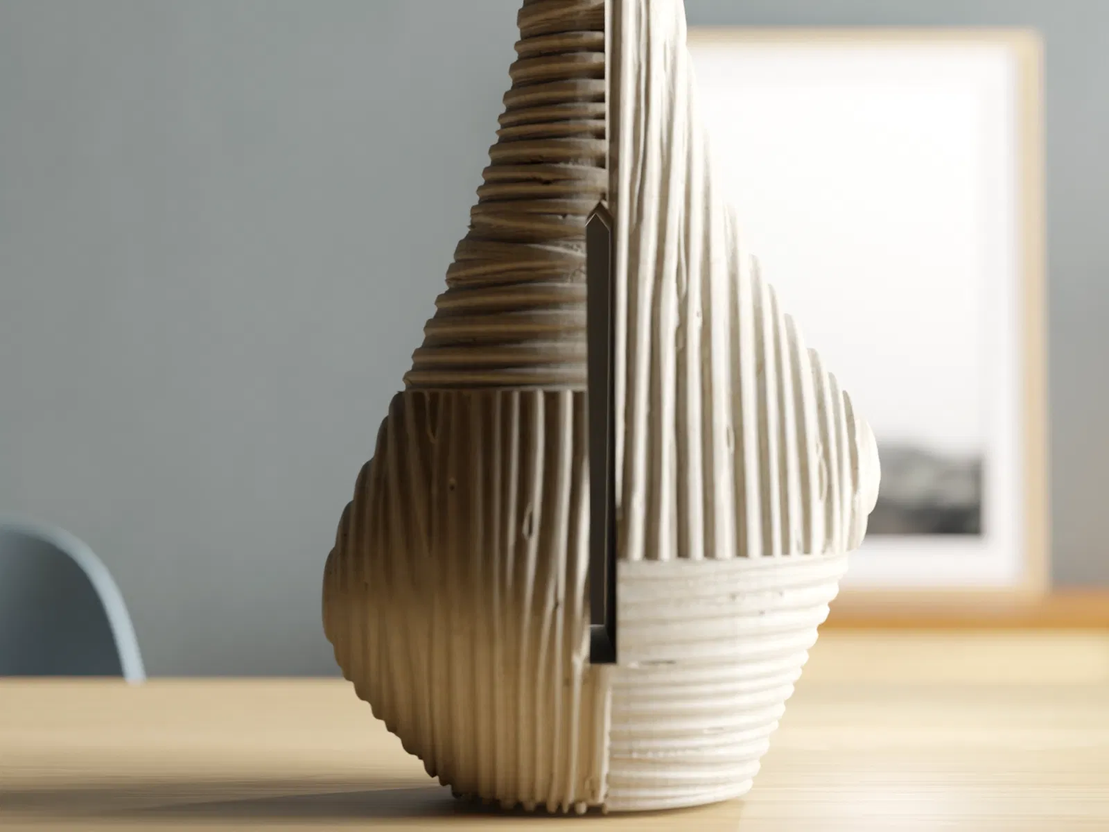 FOREST VASE là bình hoa vân gỗ chia 4 mảng với tỉ lệ/hướng texture khác nhau, tạo tương phản giữa dáng cong tự nhiên và cảm giác lắp ráp. File STL 118×108×254 mm; khuyên nozzle 0.6 mm, in chậm 35 mm/s, không hợp vase mode.