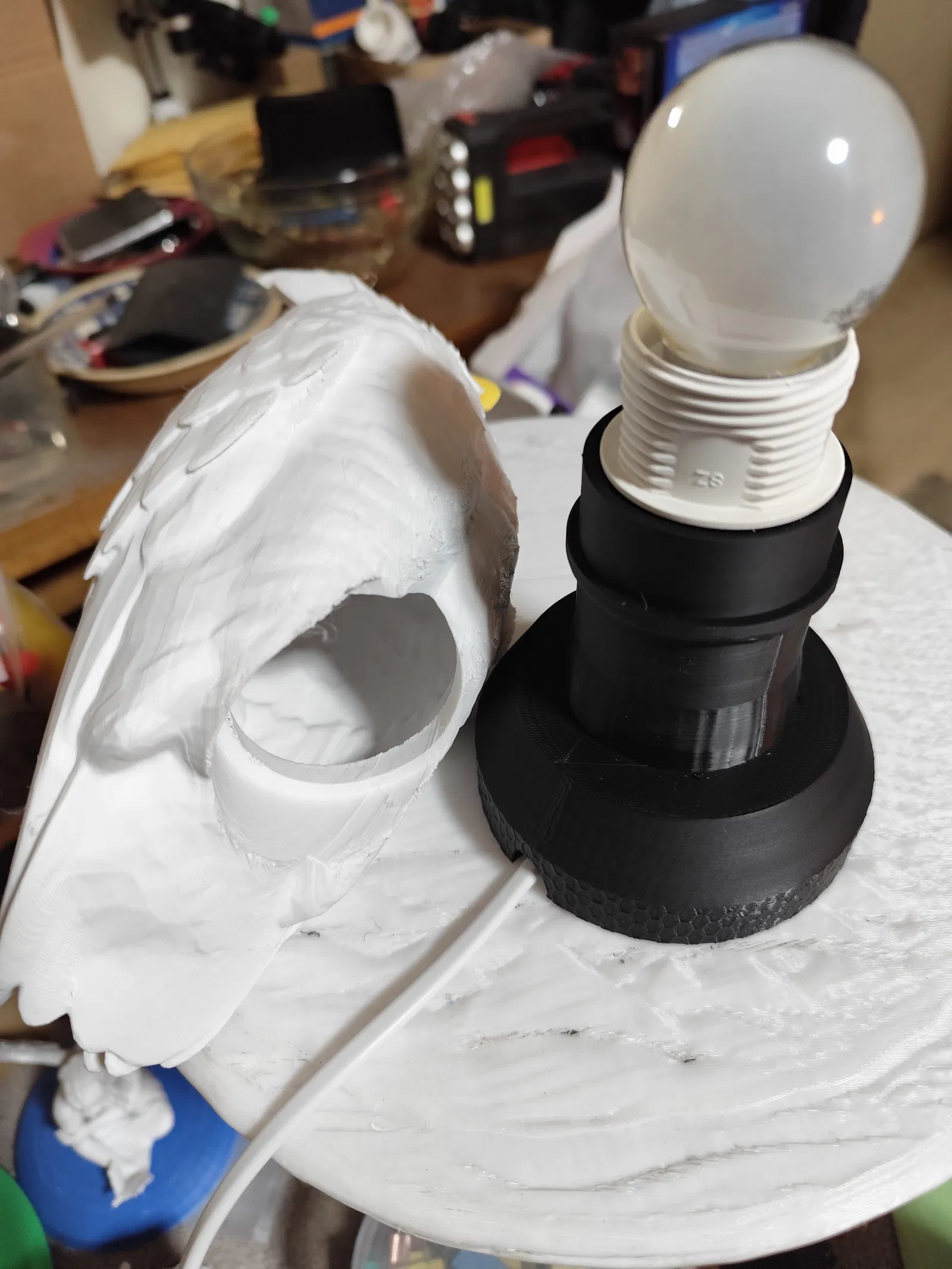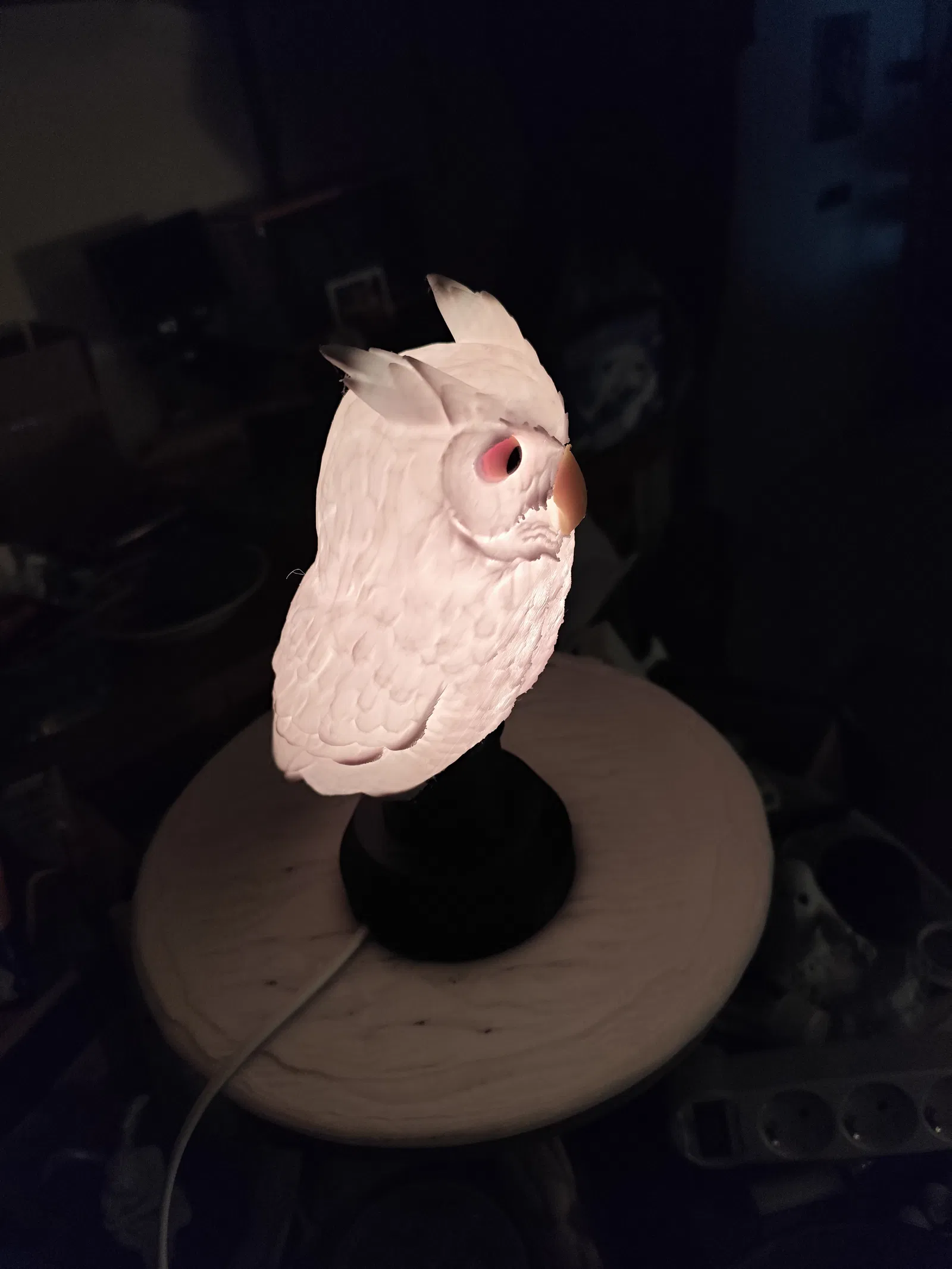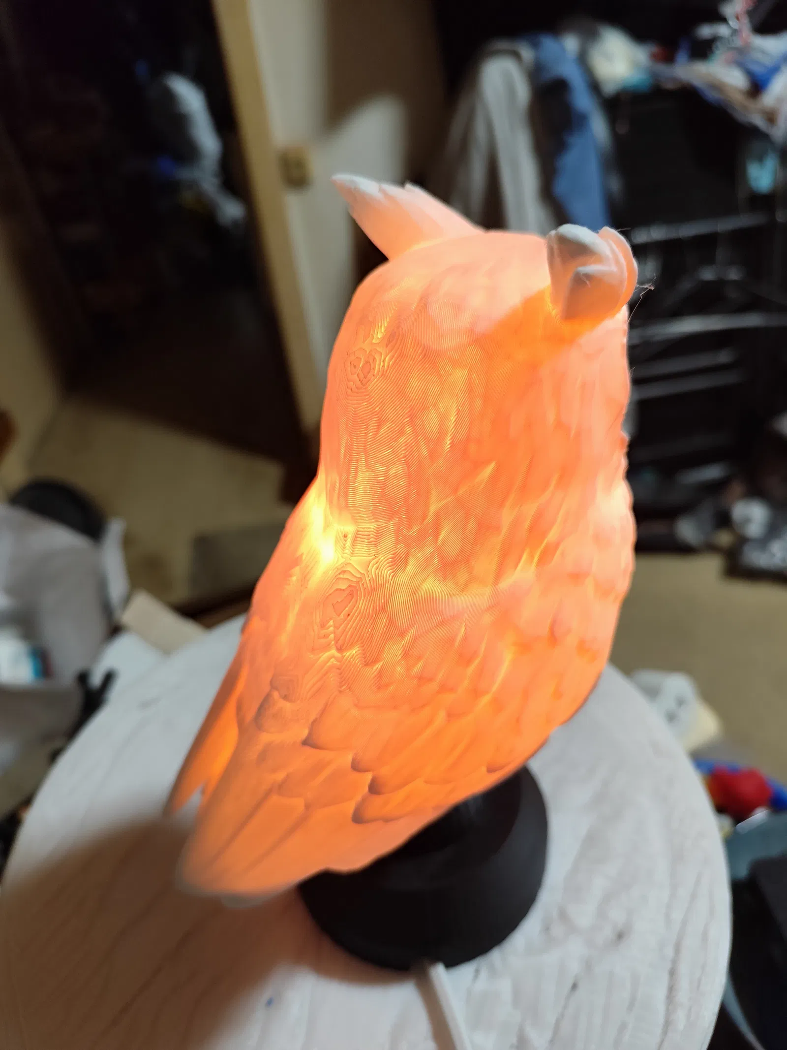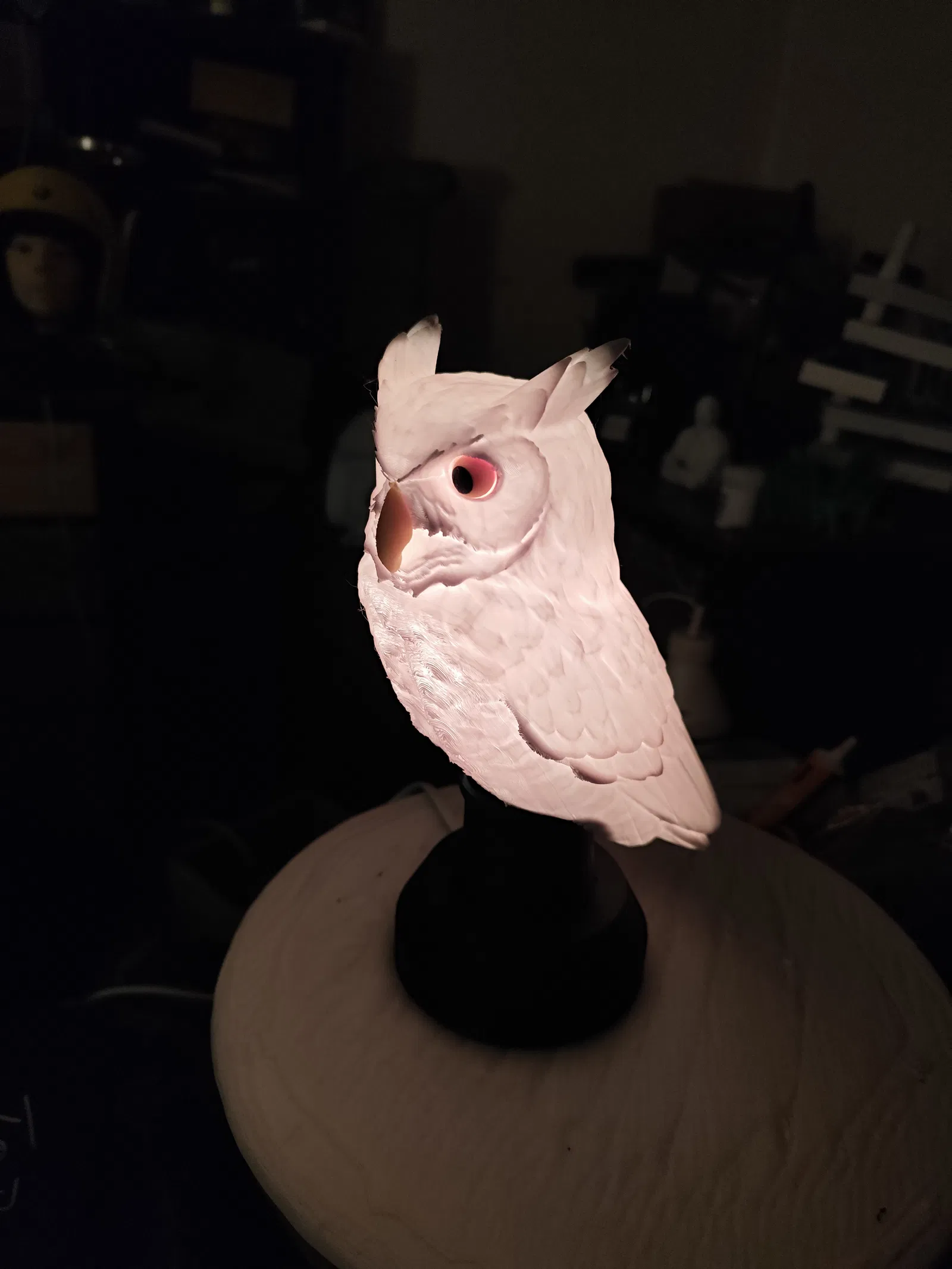 Mẫu đèn ngủ cú mèo xinh, không cần máy in nhiều màu. Chụp đèn khớp đẹp, cấu trúc đơn giản; mỏ và mắt in rời. Khuyến cáo dùng bóng LED vì bóng nóng có thể làm chảy vỏ. Có thể cần dán keo cố định mắt/mỏ.