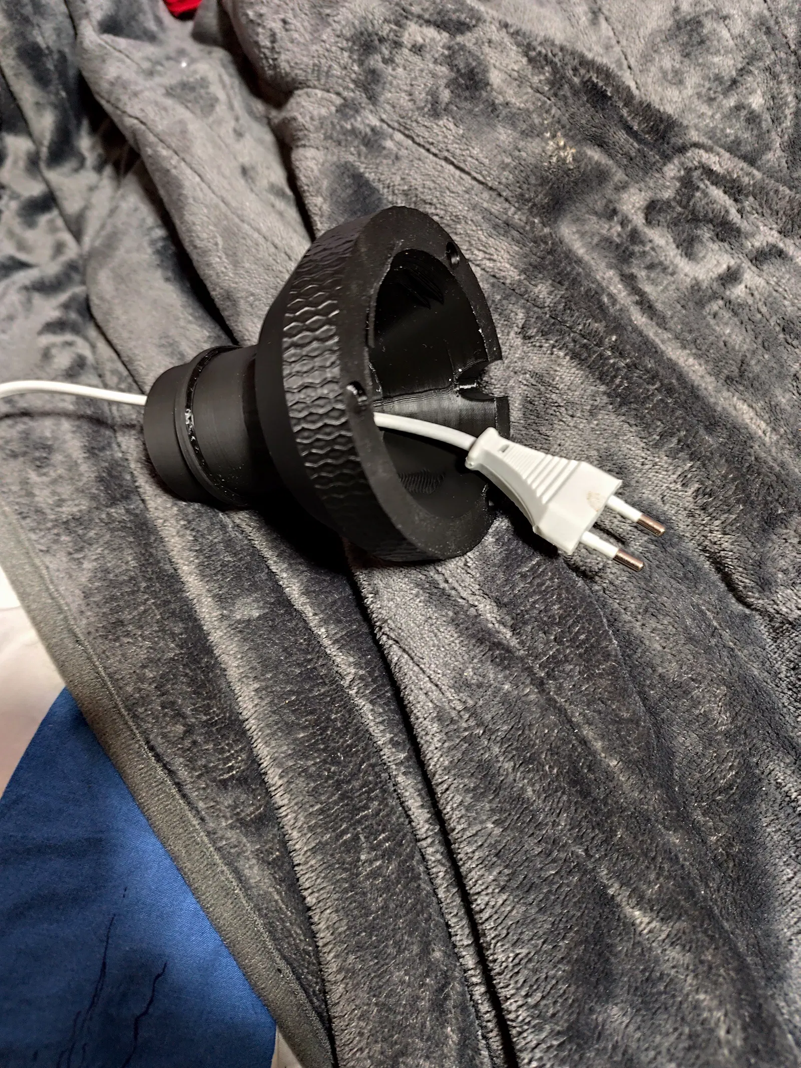 Phần chụp đèn lần này khớp khá ngon, và mình có chụp hình cho thấy kết cấu đơn giản. Mình sống ở châu Âu nên loại phích cắm mỏng 2 chấu tiêu chuẩn của bên này có thể kéo lọt qua phần chân đế nếu ráng một chút. Nếu bạn dùng phích cắm to hơn thì mình e là bạn sẽ phải đấu dây sau khi đã luồn cáp qua chân đế.