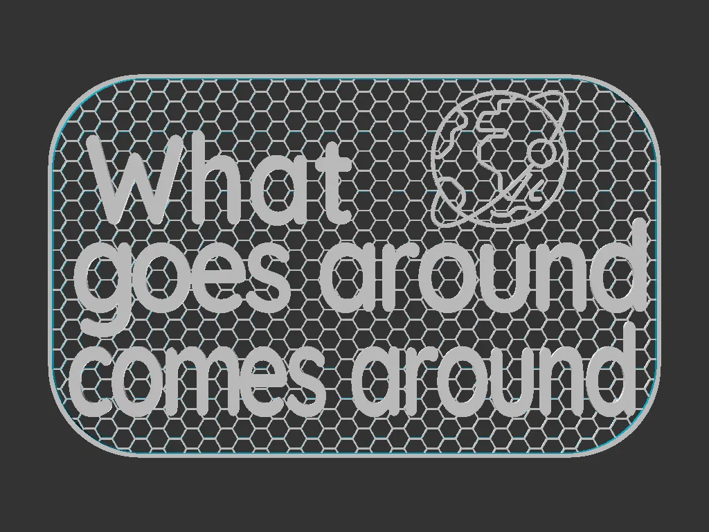 Bảng hiệu 100x160mm với hình vật thể orbit quanh Trái Đất và dòng chữ “What goes around comes around”. Có file Mesh và Solid, khuyến nghị dùng color switch trên 1mm (có gcode mẫu).