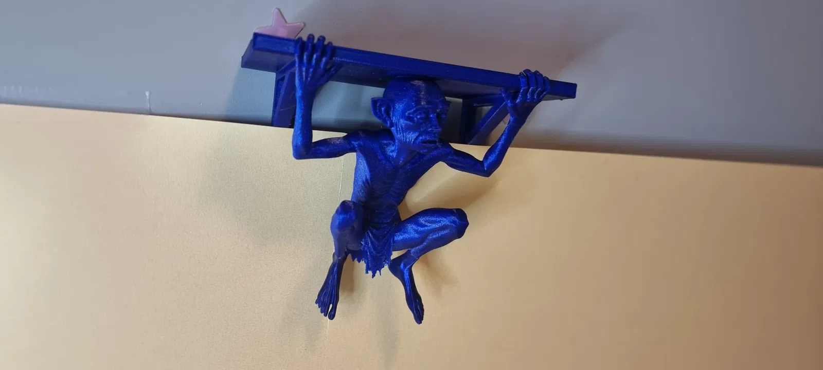 Mẫu kệ treo tường Gollum “My precious”: Gollum vừa là điểm nhấn trang trí, vừa là tay đỡ/giá đỡ chịu lực cho mặt kệ phẳng phía trên đầu. Tạo hiệu ứng như đang bám tường, rất hợp décor nhà.