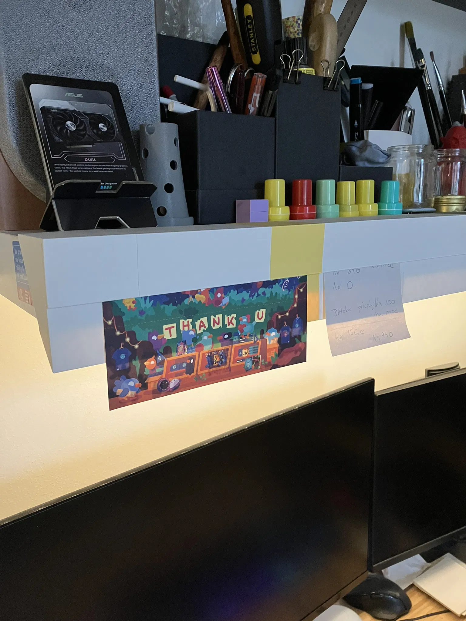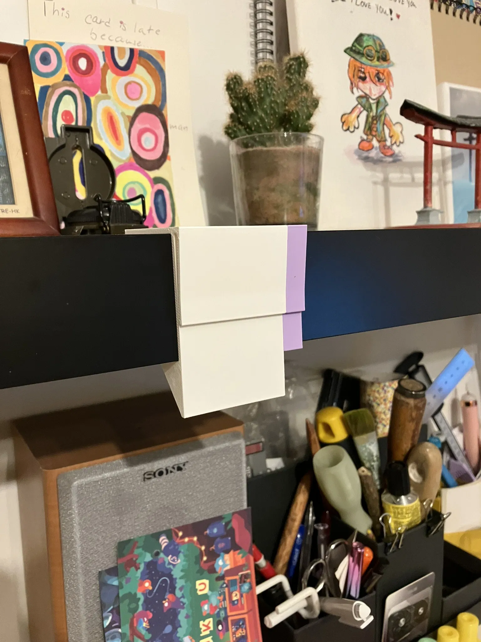 Ban đầu mình làm món này để chắn ánh sáng từ một dải LED hắt thẳng vào mắt. Mình cũng thiết kế theo kiểu này để có thể kẹp/để vài tờ ghi chú hoặc hình ảnh ở đó, giữ mấy cái deadline và những thứ mình thích luôn ở gần, gọn gàng và sạch sẽ.