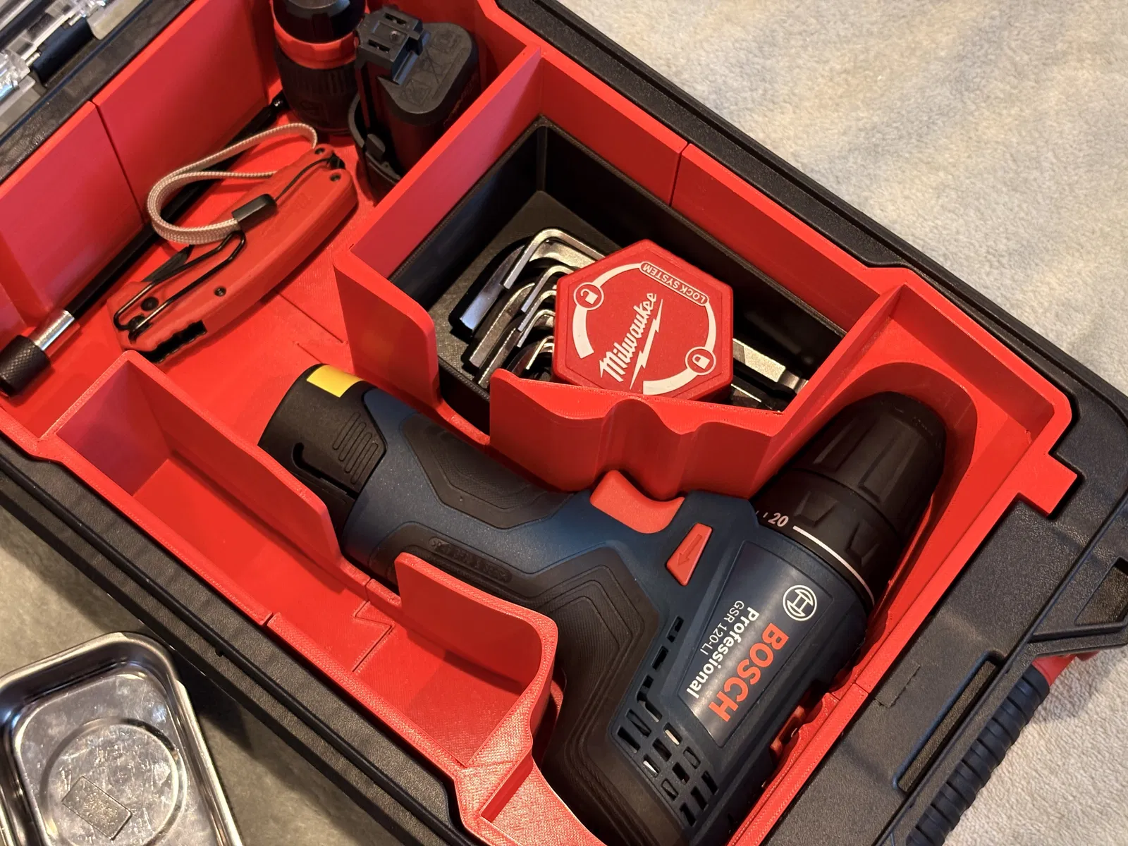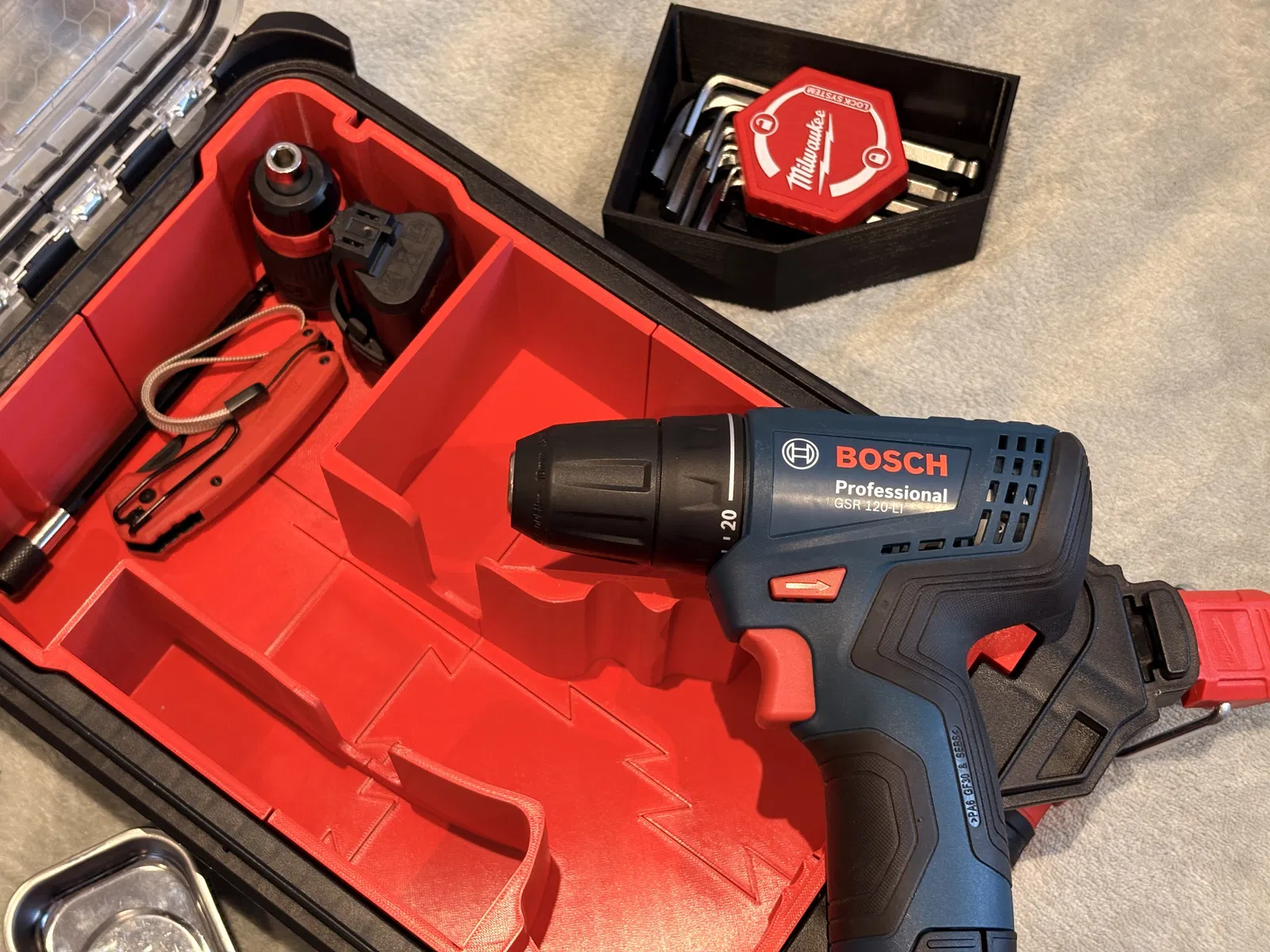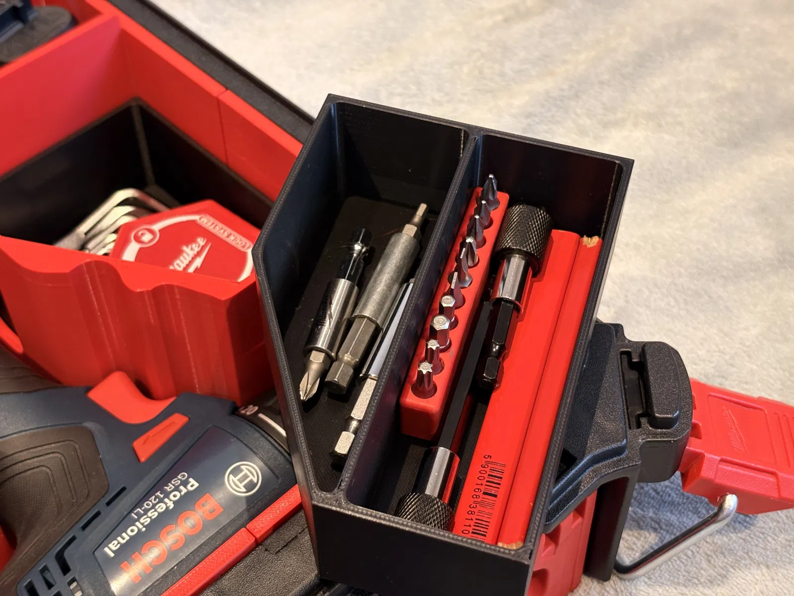 Khay insert dành cho hộp Milwaukee Packout organizer, thiết kế vừa cho máy khoan Bosch GSR 120-Li. Thích hợp để sắp xếp gọn gàng trong Packout; thông số in gợi ý: layer height 0.20, infill 12%, 2 perimeters.