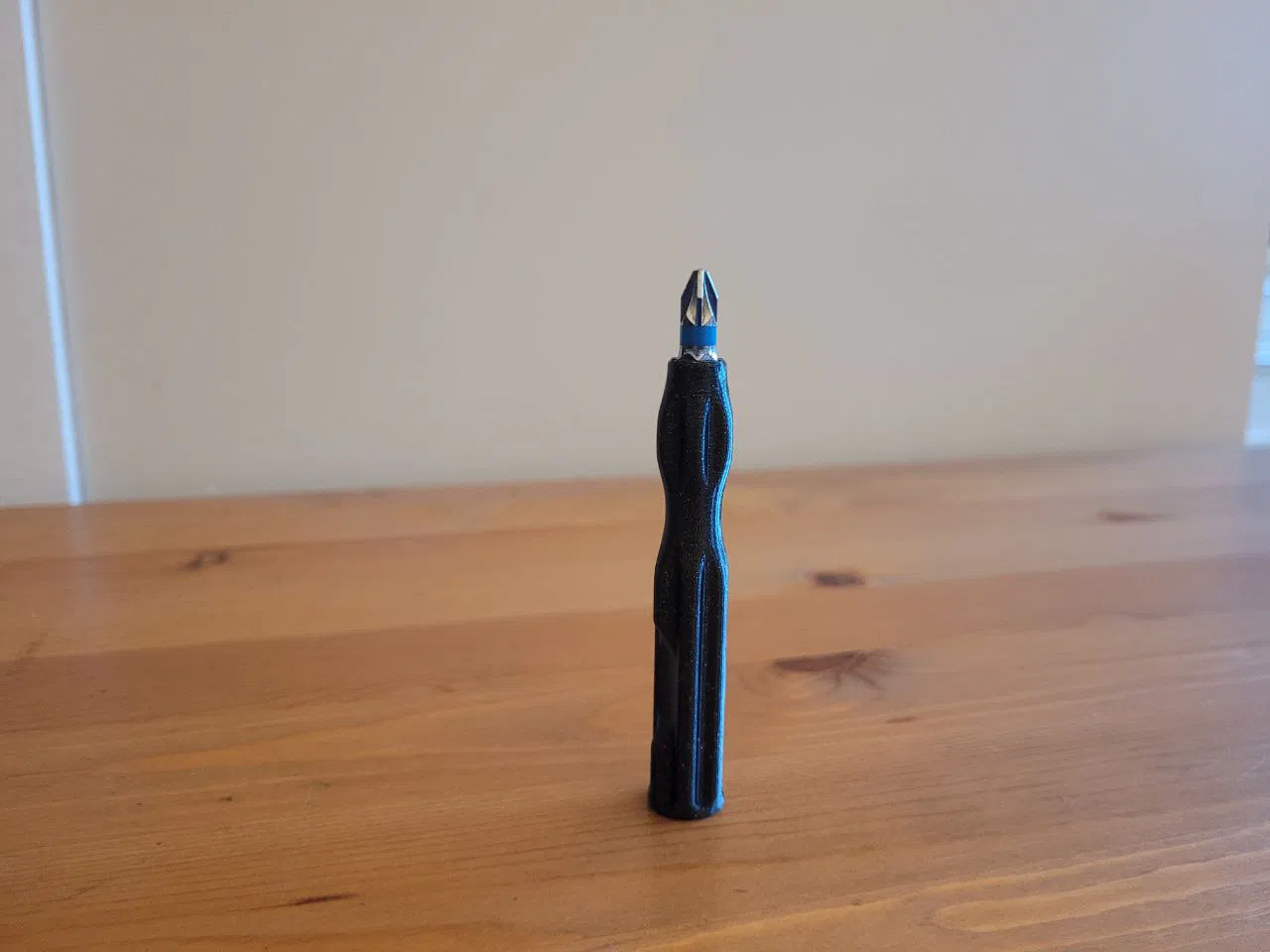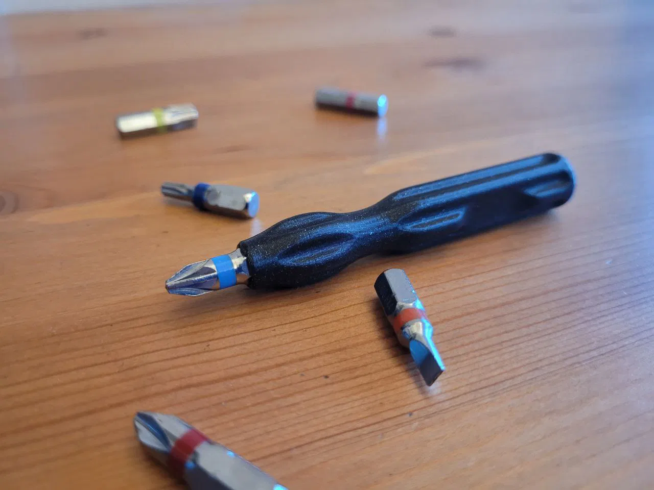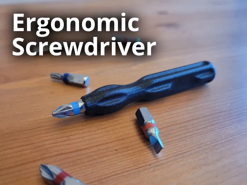 Mẫu tuốc nơ vít công thái học kèm giá giữ đầu bit nhỏ gọn, dùng được với các bit tiêu chuẩn. Có thêm bộ file STL hỗ trợ nhiều kích cỡ nam châm; bản gốc không nam châm vẫn giữ bit ổn nhờ dung sai chặt.