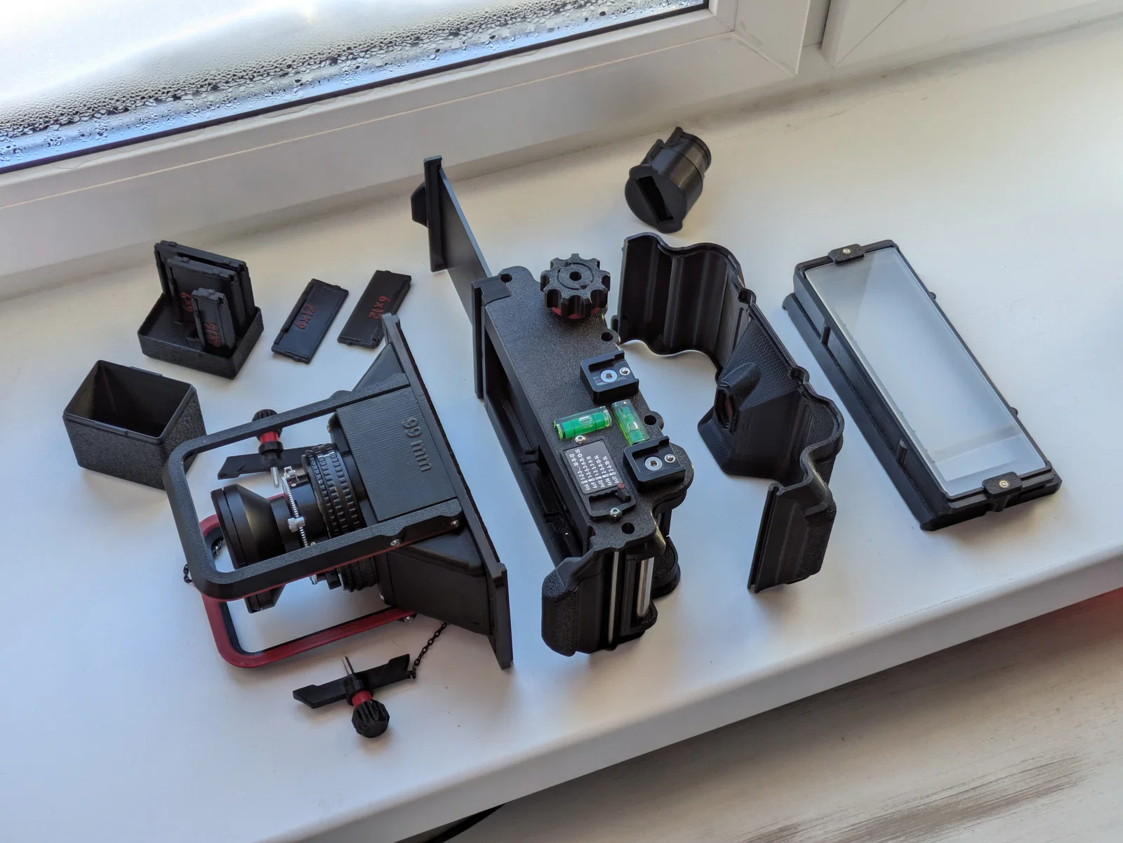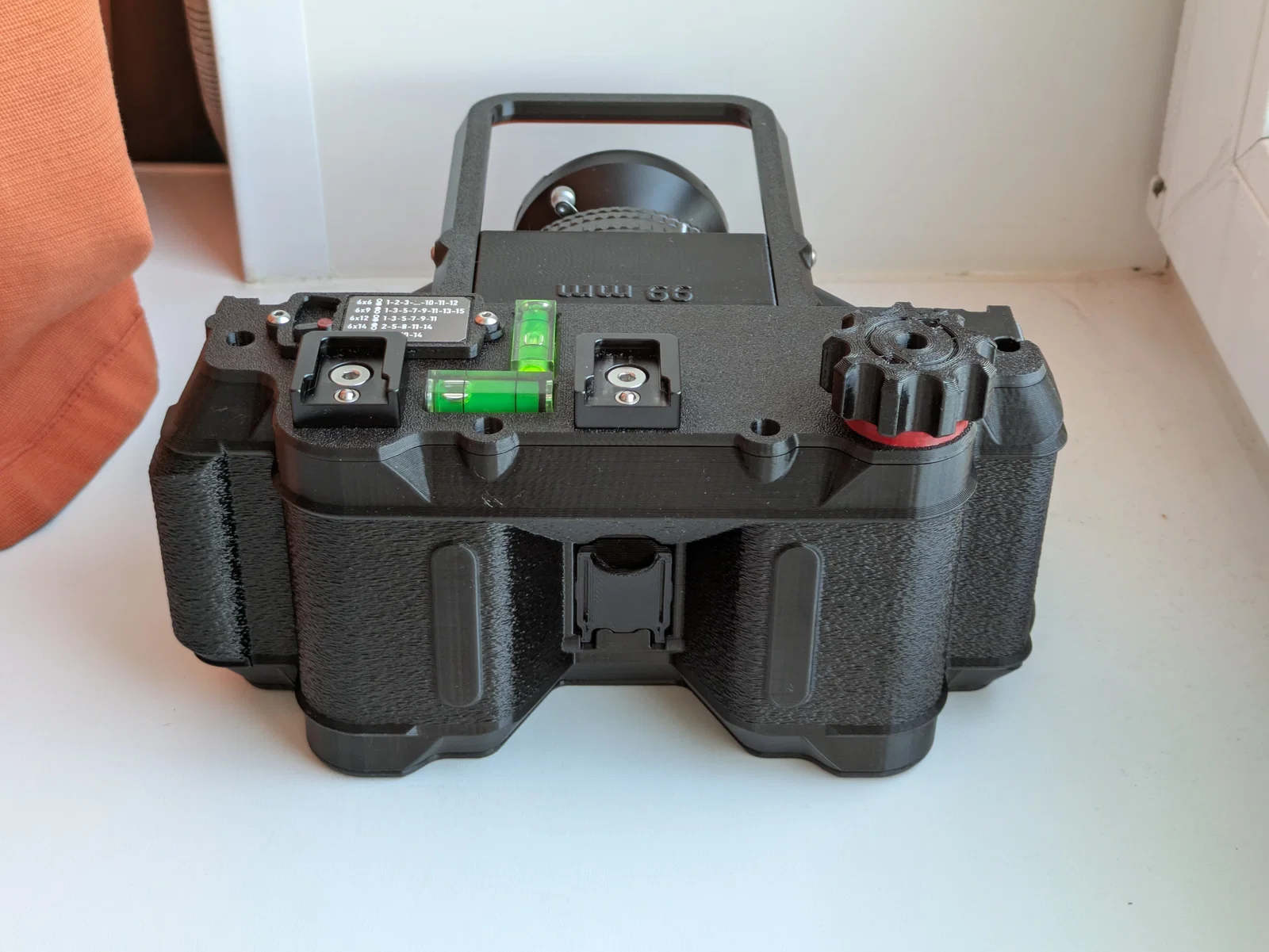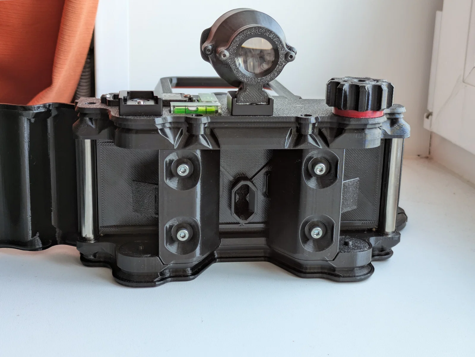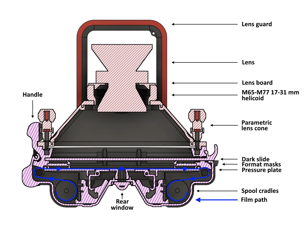 Lens cone để gắn helicoid và lens. Nó cũng đóng vai trò như thân chính của camera vì có điểm gắn tripod ở trung tâm, điểm gắn dây đeo và các phần khác được siết vào bằng 2 vị trí gắn ốc tay M4 (thumbscrews).