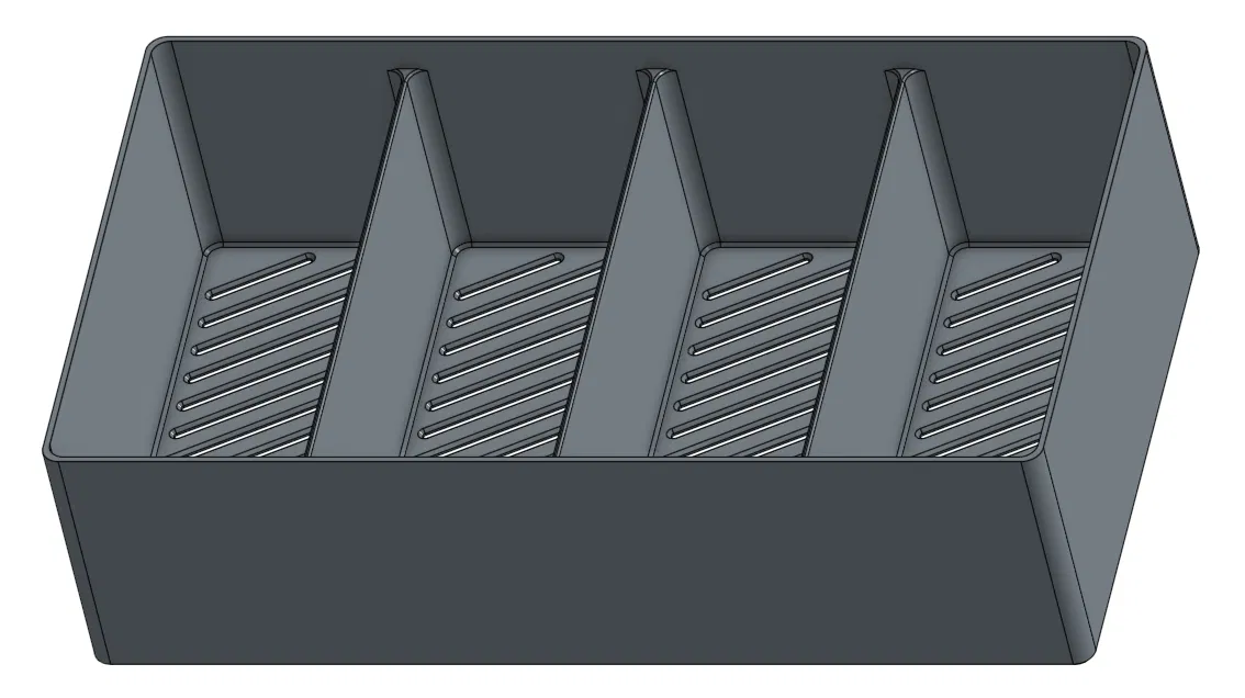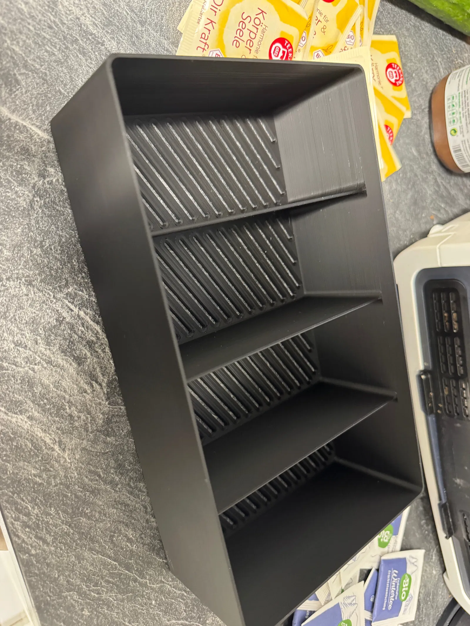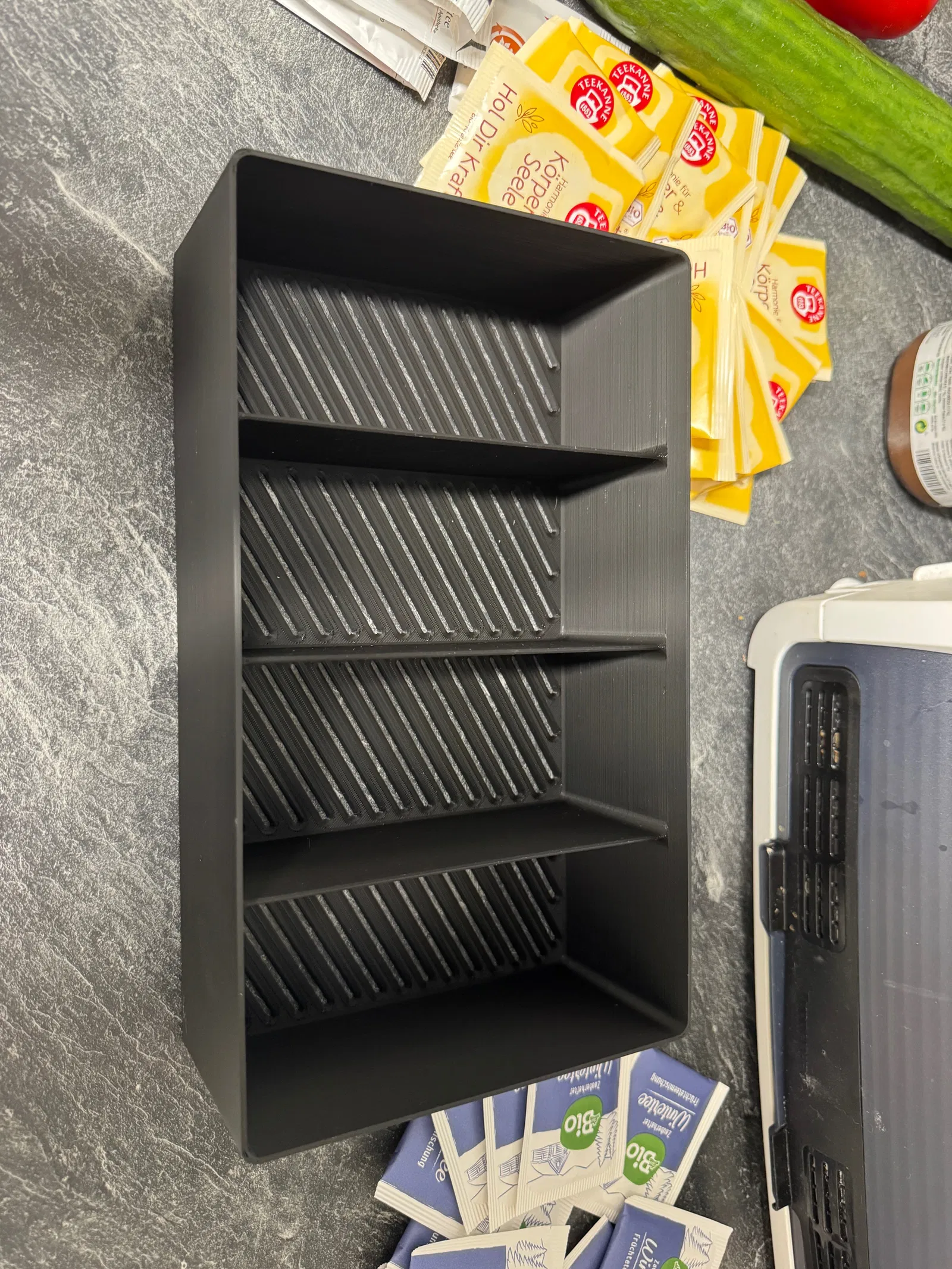 Khay lưu trữ túi trà đơn giản, chứa được nhiều teabag hoặc vừa 1 hộp tiêu chuẩn. Mỗi ngăn 64×150×75 mm. Có bản 4 ngăn cho máy lớn (264×152 mm) và bản nhỏ hợp build plate 225×225 mm.
