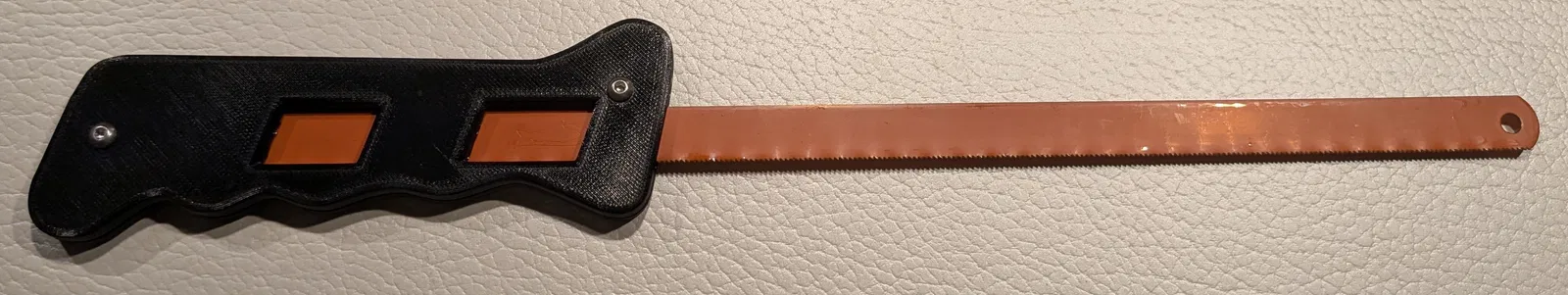 Tay cầm cho cưa sắt (hacksaw). Bản remix bổ sung 2 lỗ ren để bắt 2 ốc M3x8; một ốc xuyên qua lưỡi cưa giúp cố định chắc, hạn chế trượt khi sử dụng.