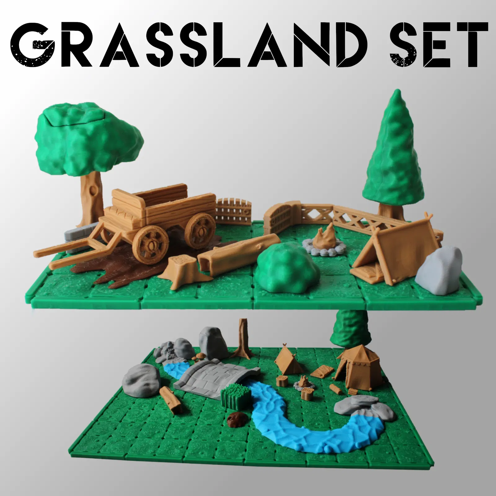 Bộ Grassland Set thuộc hệ tile DungeonFab, phiên bản đồng cỏ với suối và đường modular. Chỉ cần print, tháo khỏi bed rồi snap lại; đa số không cần supports. Hỗ trợ xây nhiều tầng, tháo lắp gọn và tiết kiệm filament.
