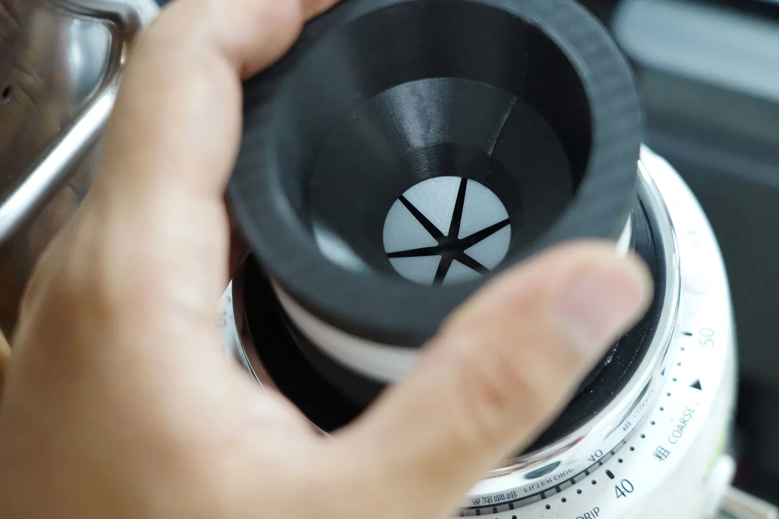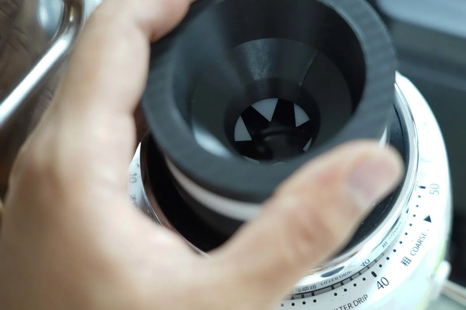 Giảm bột cà phê còn sót lại, cho phép burr quay trước khi xay, đồng thời dùng như cốc đong/cân hạt.