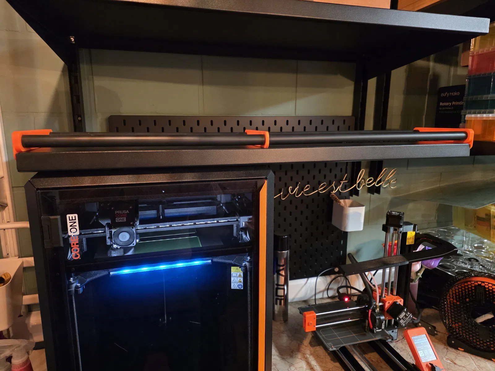 In trên Prusa Mini với prusament PLA Prusa Orange, 0,20mm structural, 15% grid infill. Lắp ráp với 2 ống điện đường kính 20mm, dài 85cm. Có thể để vừa 2 rack cuộn filament trên một tầng kệ Ikea Bror.
