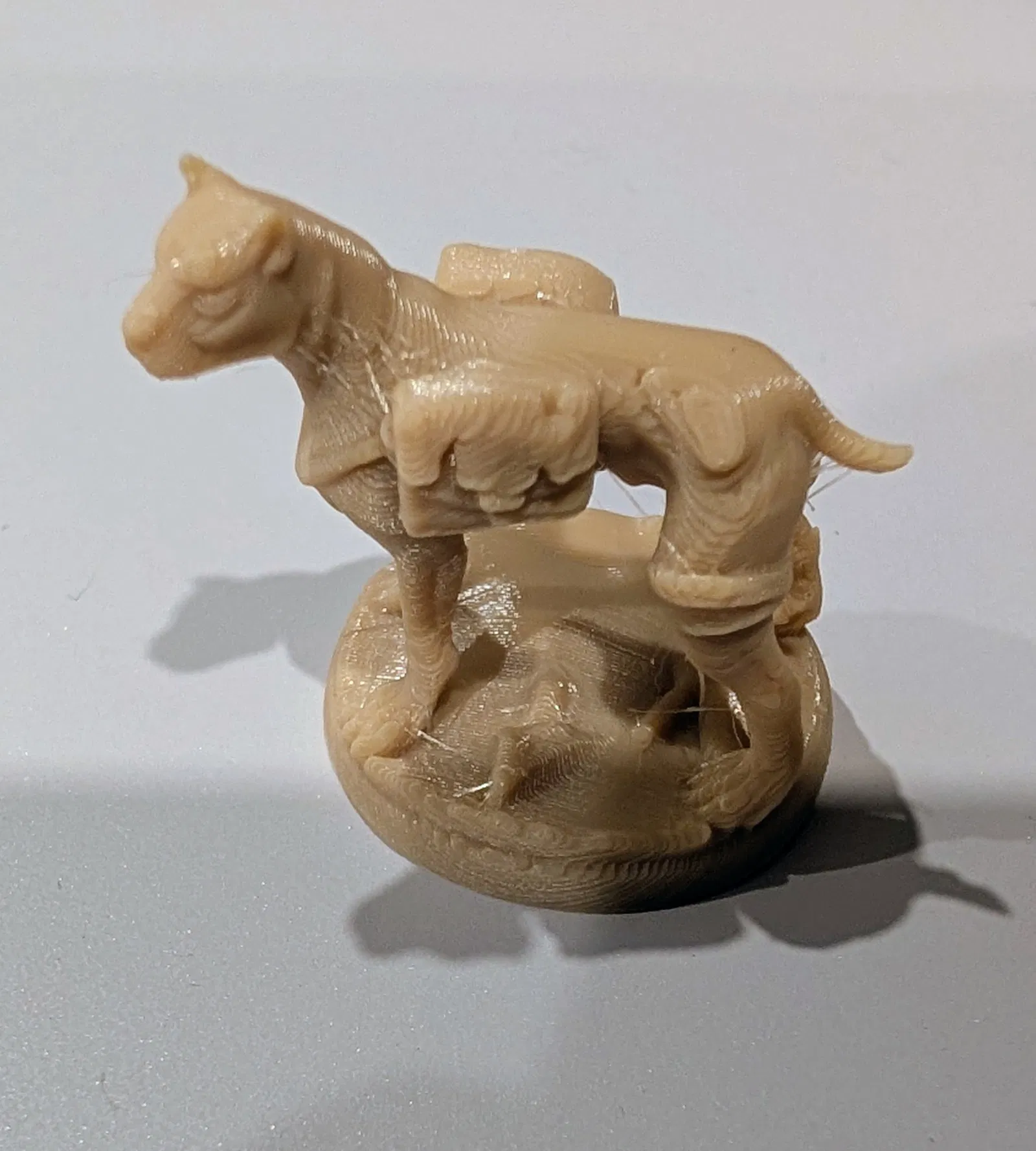 Nhân vật chó cho boardgame Robinson Crusoe. Ảnh 2D gốc mình lấy từ trên Internet rồi đưa vào một công cụ tạo 3D để xuất ra file .stl. Mình không biết 3D model nên chi tiết của tượng khá đơn giản, nhưng đủ dùng cho mục đích của mình. File .stl đính kèm để bạn tự chỉnh theo ý, còn file 3MF là cái mình in ra thành công. In ở góc 315° để mặt nó hướng lên trên sẽ giúp kết cấu ổn hơn khá nhiều.