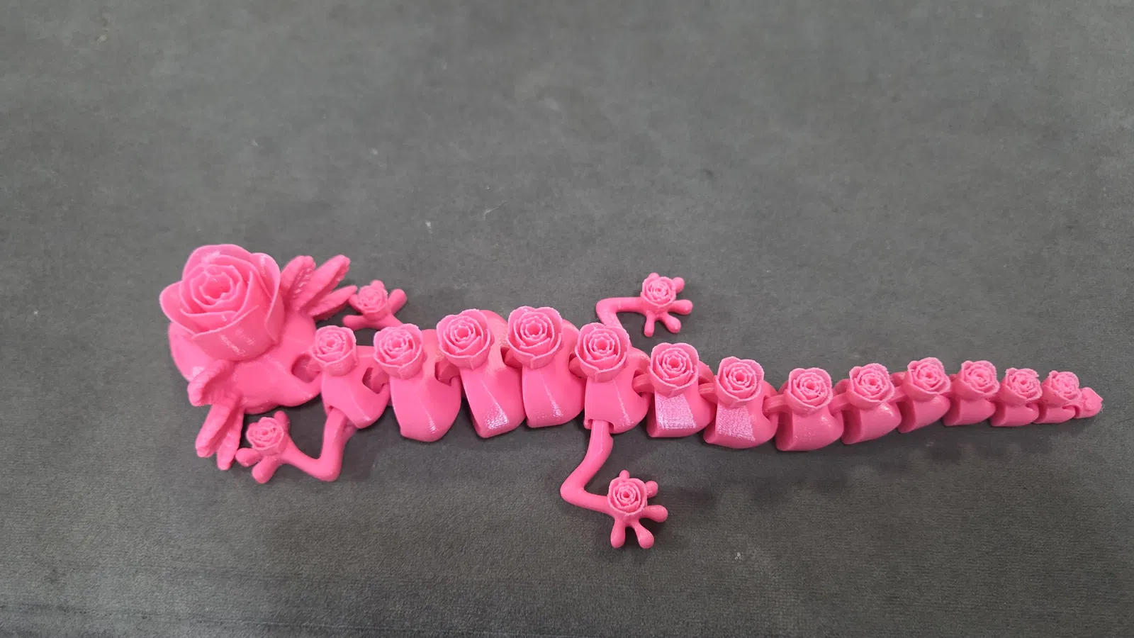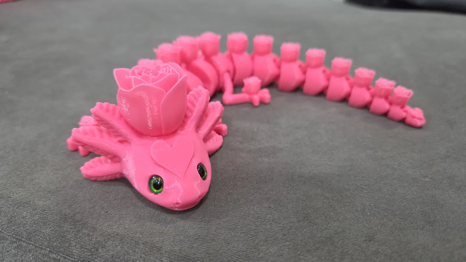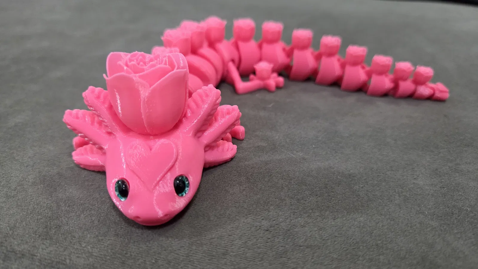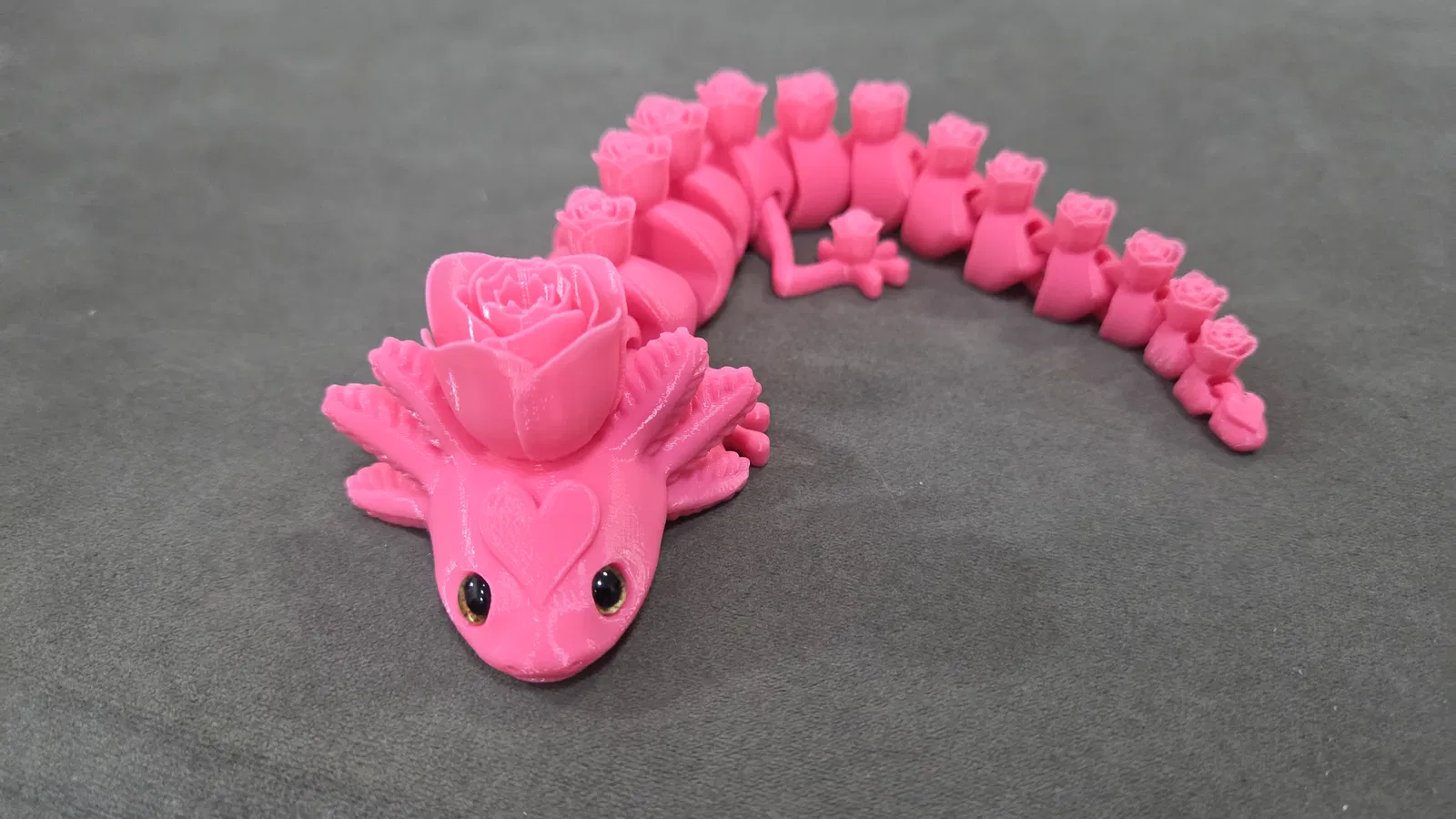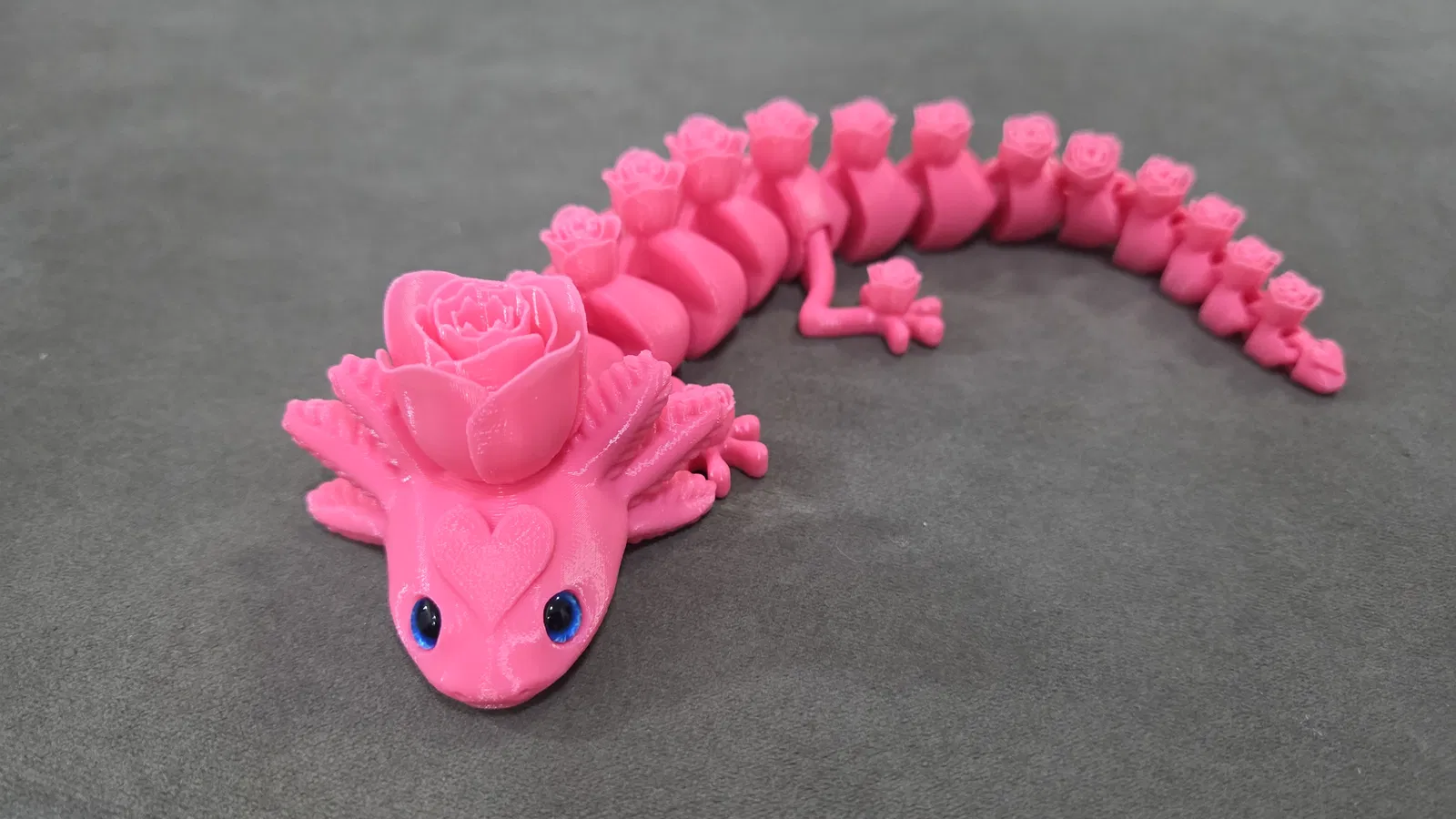 Rosolotl là bản Axolotl khớp nối do AKinferno thiết kế, nay được remix để gắn mắt kính 6mm/8mm và trang trí hoa hồng. In không cần support/brim; khuyến nghị layer 0.12mm, infill 8%.