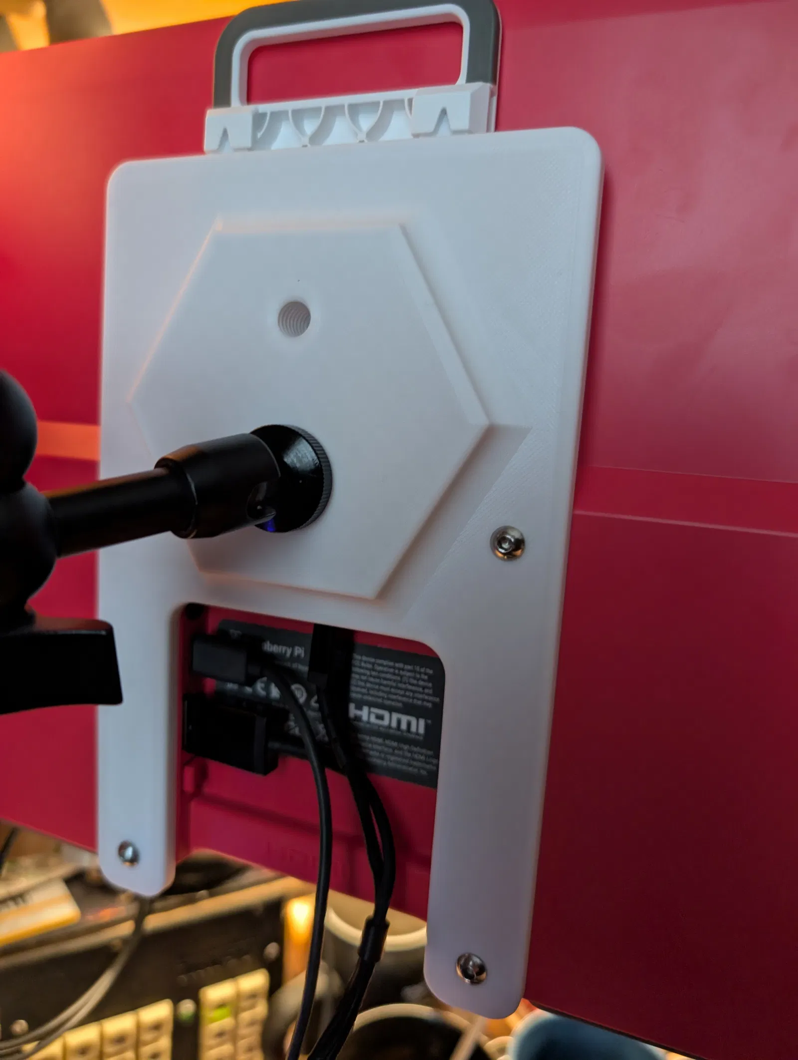 Ngàm gắn tripod cho Raspberry Pi Monitor (hoặc bất kỳ thiết bị nào có chuẩn ngàm VESA 100mm). Có 2 phiên bản: một bản gọn và ổn định hơn, phù hợp với đa số thiết bị dùng VESA. Bản thứ hai là phiên bản chuyên cho Raspberry Pi Monitor, tận dụng ốc ngàm VESA và các móc trên chân đế màn hình, giúp thao tác/cắm các cổng của màn hình dễ hơn.