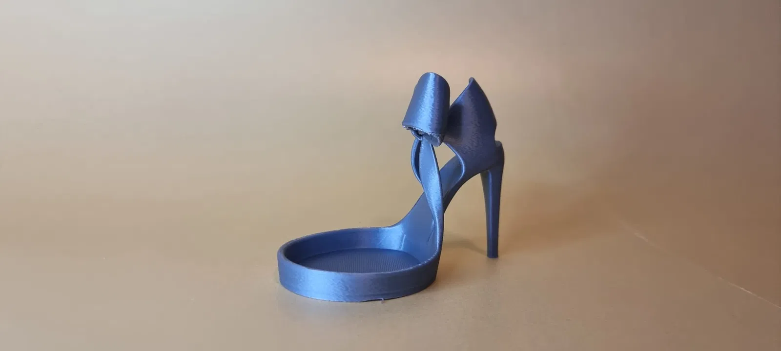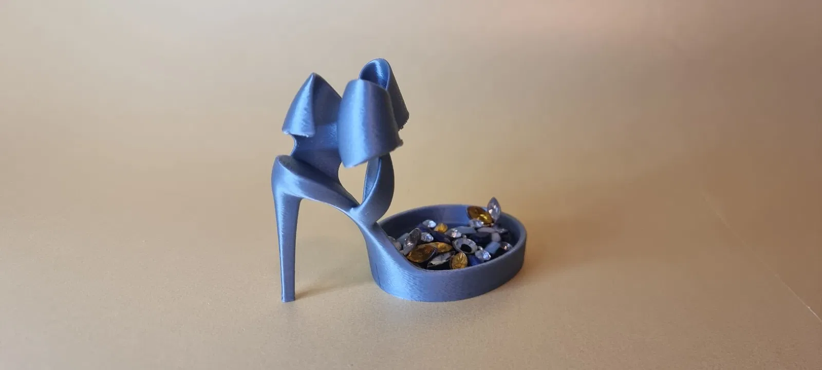 Mẫu khay/đồ trang trí hình giày cao gót với dáng thanh lịch, phía trên là nơ bản to, cứng cáp. Lớp hoàn thiện màu xanh xám ánh kim (slate-blue) tạo vẻ hiện đại, sang và dễ hợp với nhiều kiểu decor. Phần “đế” của đôi giày được thiết kế như một lòng khay nông, hơi lõm xuống, rất hợp để đựng mấy món nhỏ như nhẫn, bông tai, đá quý rời.
