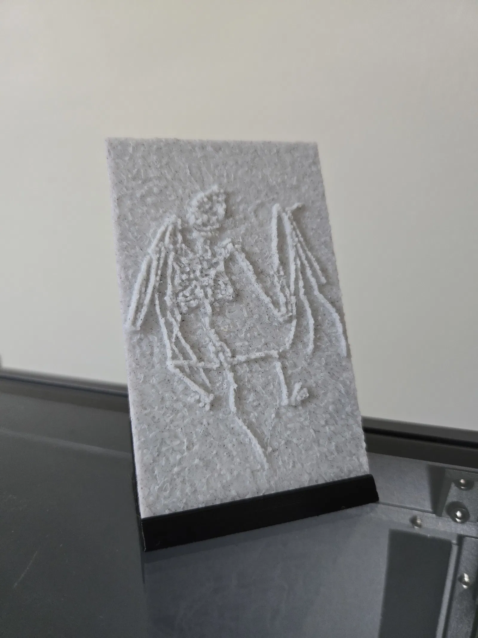 Lithophane cỡ thẻ tín dụng từ hóa thạch holotype của dơi cổ đại _Icaronycteris gunnelli_. Có thể chỉnh tương phản bằng cách scale chiều cao trong slicer và chỉnh độ sáng nền bằng cách sink xuống bed.