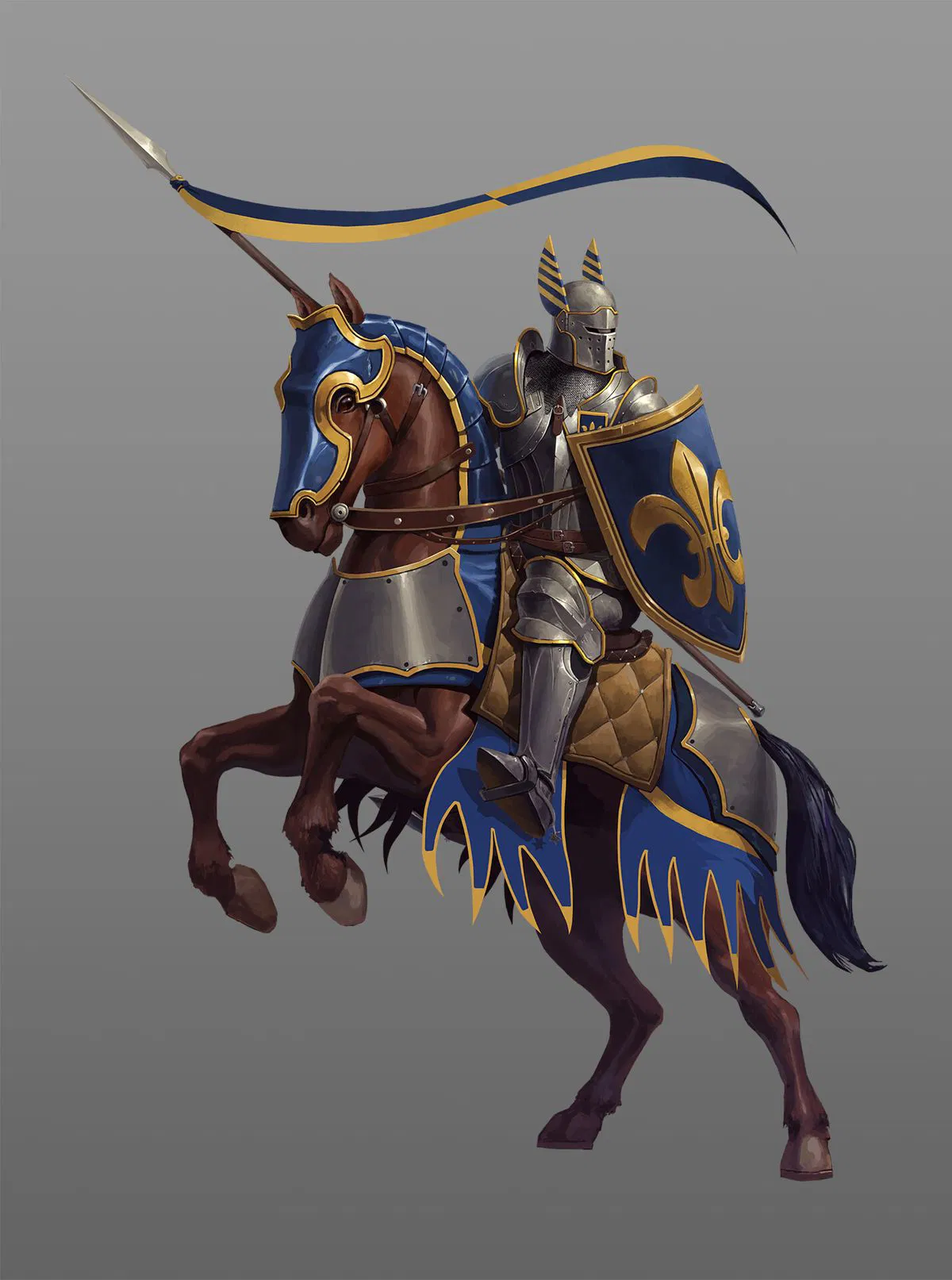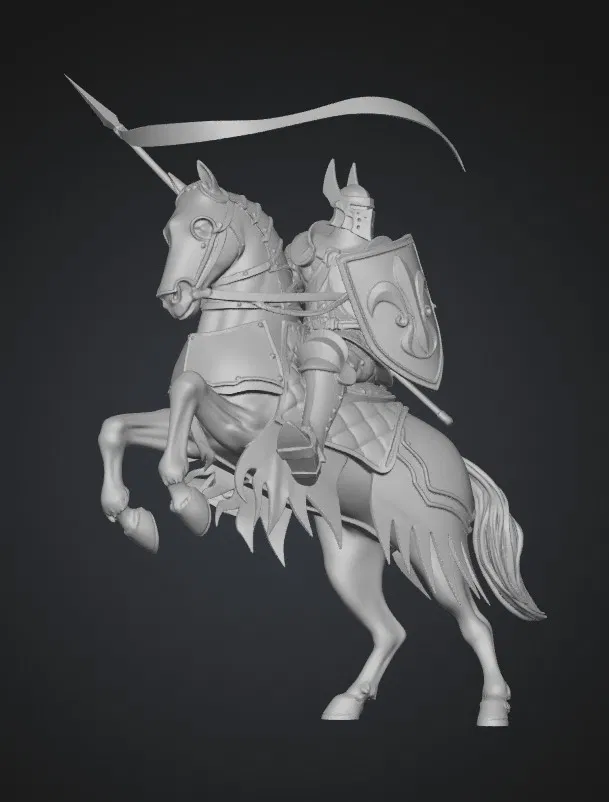 Model “Fleur-de-Lis Knight on Blue Warhorse” mô tả một kỵ sĩ mang biểu tượng Fleur-de-Lis cưỡi trên chiến mã màu xanh. Phù hợp để in 3D làm mô hình trưng bày hoặc sưu tầm.