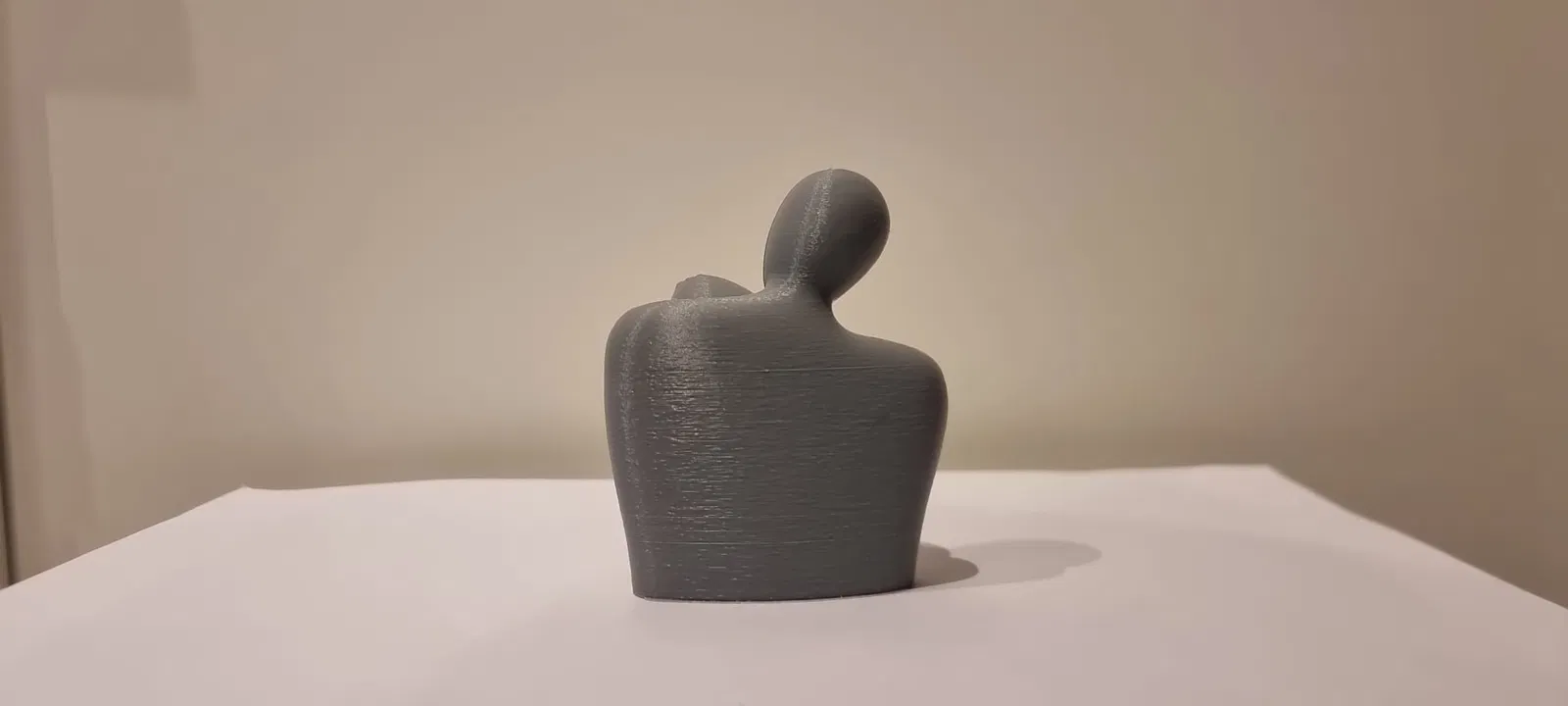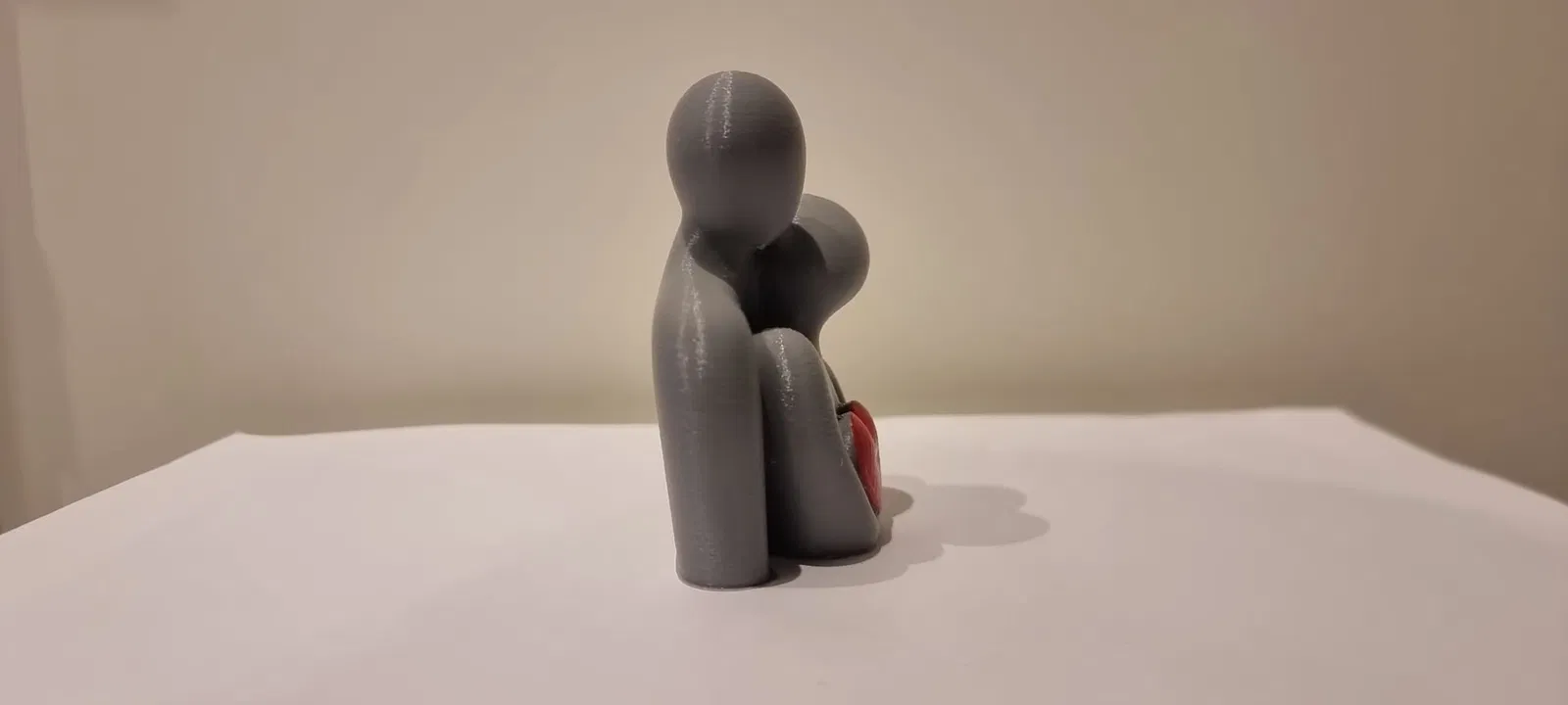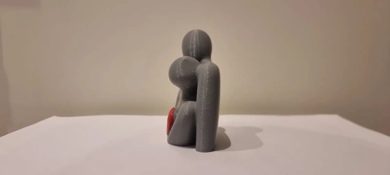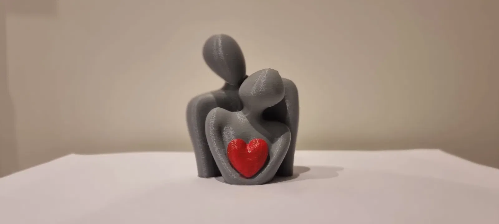 Mô hình điêu khắc hai hình người cách điệu ôm nhau, gợi cảm giác chở che và gắn kết. Điểm nhấn là trái tim đỏ được giữ ở trung tâm. Gợi ý in: supports 3 auto, outer brim 10 mm, layer 0.16–0.20 mm.