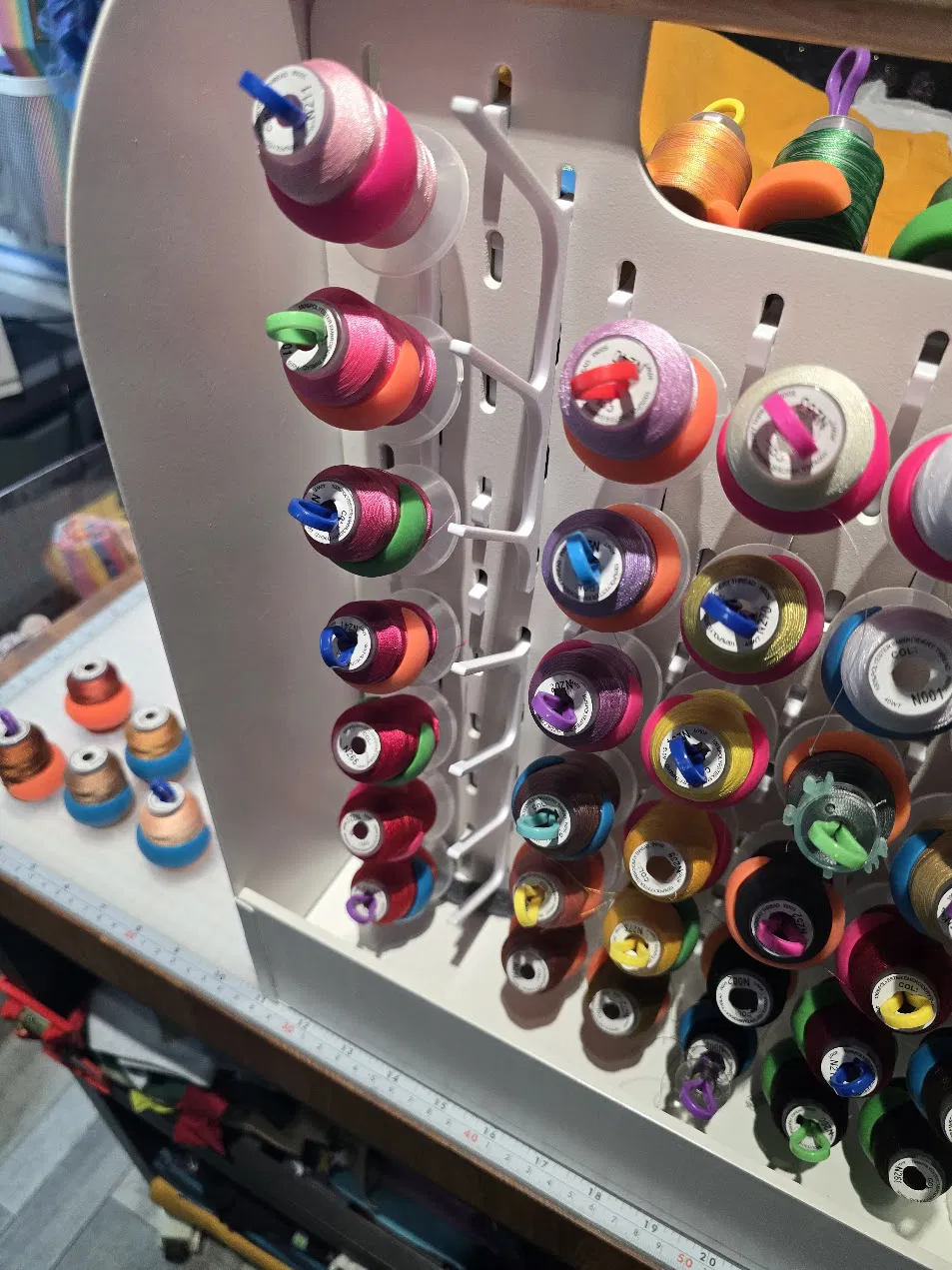 Các ngàm giữ cuộn (spool holder) dành cho cuộn chỉ thêu Brothread. Có 2 phiên bản 4 chấu và 3 chấu để bạn tối ưu số lượng cuộn chỉ có thể gắn trong khay pegboard Vattenkar.