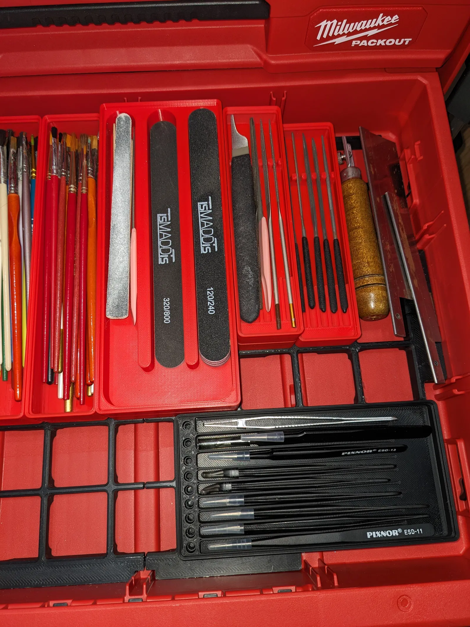 Mình sống trong một căn nhà kiểu “three decker”, nghĩa là dù sở hữu nhà riêng nhưng thực tế mình vẫn ở dạng căn hộ. Điều này gây khó cho mấy thú vui như làm mô hình, scratch building và sơn miniature cho wargaming vì bị giới hạn không gian. Lúc đang làm thì bày ra thoải mái cũng được, nhưng khi không dùng thì mọi thứ phải cất gọn càng nhỏ càng tốt. Milwaukee PACKOUT là lời giải quá hợp cho chuyện này — nhưng vẫn chưa hoàn hảo. Mình đã đổi cách xếp stack một lần do có thêm hai món mới ra mắt, nhưng vẫn cần tinh chỉnh thêm để đúng nhu cầu.