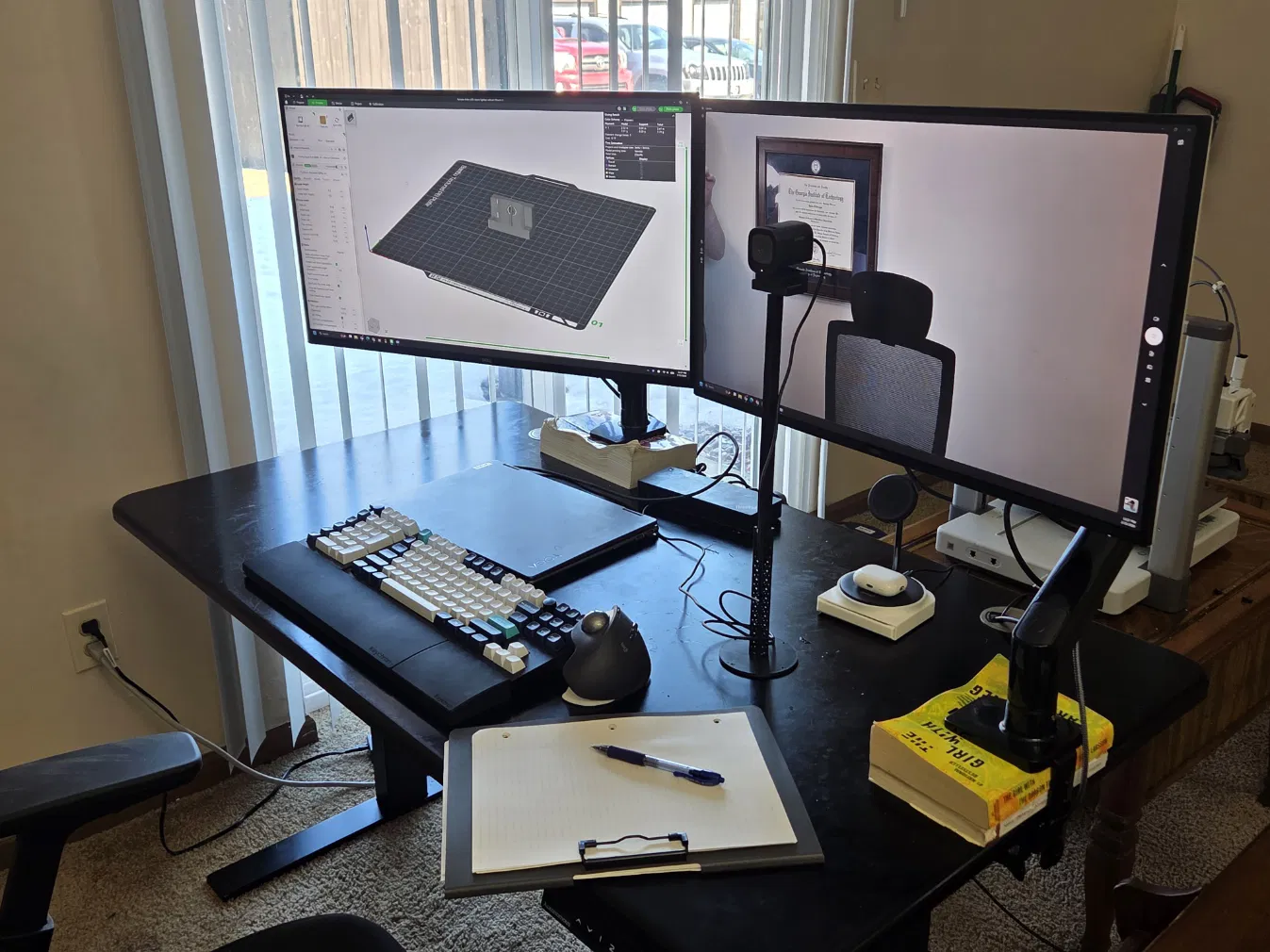 Màn hình của mình đã được kê sao cho tâm màn hình ngang với mắt, nhưng mình không tìm được mẫu giá đỡ camera in 3D nào đủ cao để đặt webcam đúng vị trí. Nên mình tự thiết kế luôn.