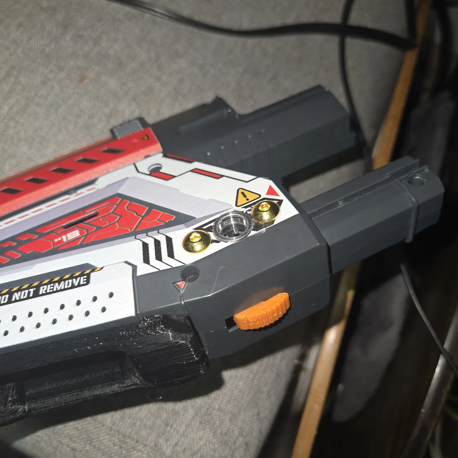 Cuối cùng, gắn mount vào bên trong vỏ blaster như hình. Bạn sẽ thấy heat-set insert ngang mặt vỏ hoặc nhô lên nhẹ. Test fit trước khi ráp lại blaster, rồi chơi thôi!