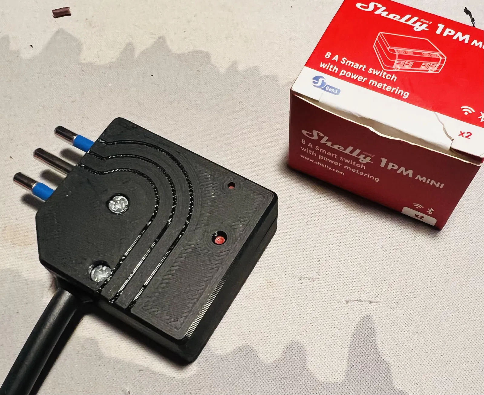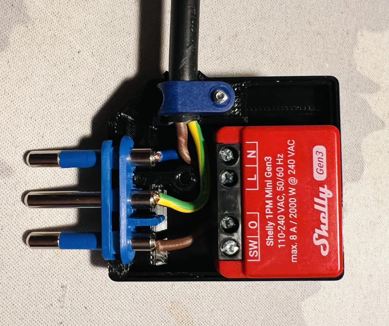 Dự án này làm đúng y vậy: mình lấy một loại phích cắm rất phổ biến ở các cửa hàng DIY ở Ý (Polypool 410) và thiết kế lại toàn bộ vỏ ngoài để ôm gọn một Shelly 1PM Mini Gen3 bên trong.