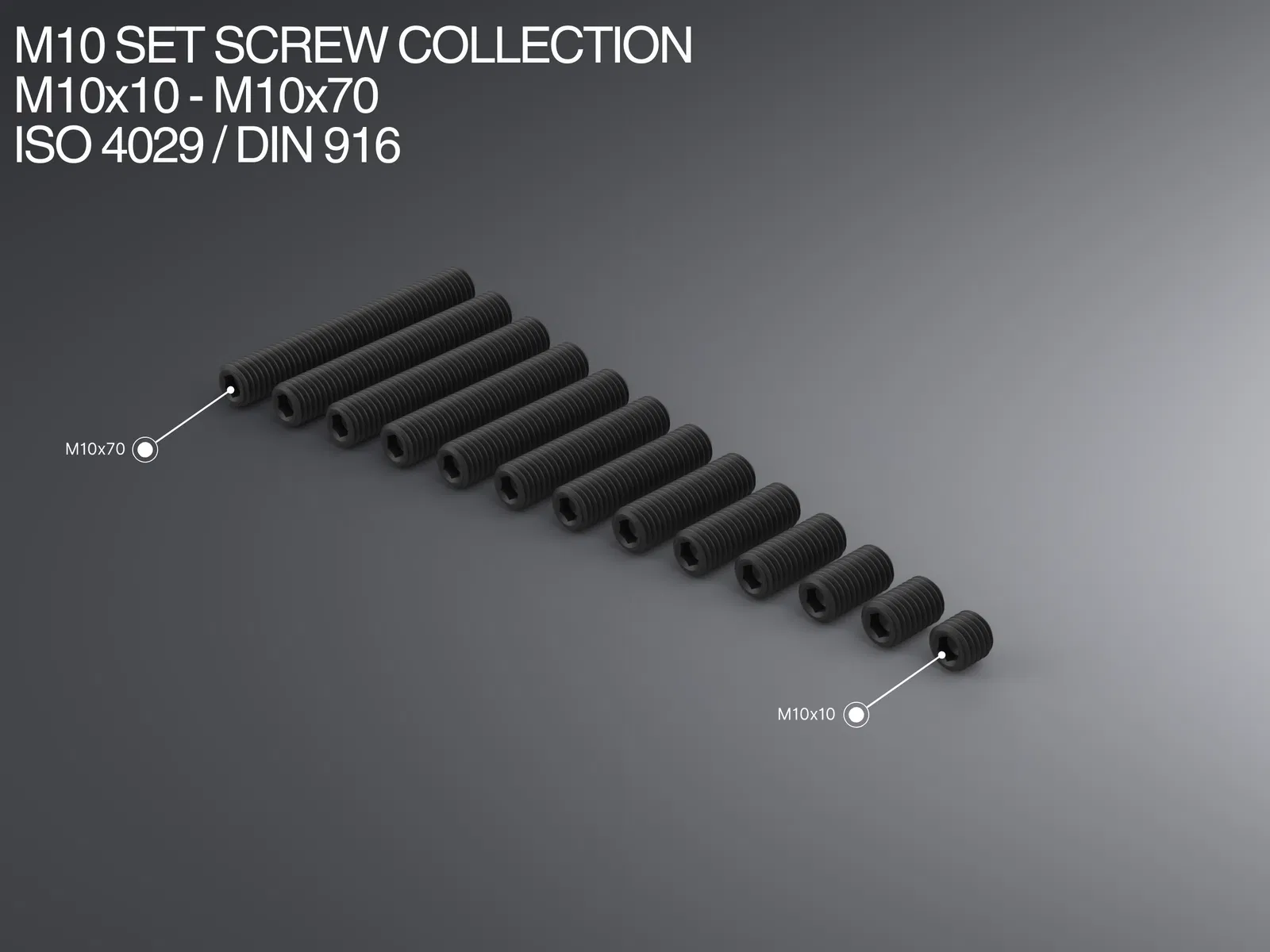 Bộ sưu tập set screw M10 theo chuẩn ISO 4029 / DIN 916, gồm nhiều chiều dài từ M10x10 đến M10x70. In PETG/PLA dùng ổn cho nhu cầu thường; nếu cần bền hơn nên chọn vật liệu dai hơn. Nếu quá khít, giảm scale 0.5–1%.