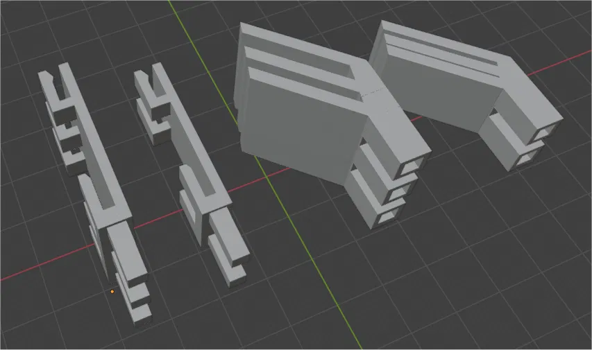 Mình đo rất cẩn thận, rồi dùng OnShape và Blender để dựng các chốt (peg inserts) sẽ cắm vào giữa các thanh để khỏi bị lắc, kèm theo phần kẹp để gài vào. File này có cả kiểu 2 chốt và 3 chốt. Mình đoán kiểu 3 chốt sẽ cần thiết, vì nếu kẹp in 3D không giữ chắc thì phần mái/phần nối cao thêm sẽ rớt xuống và hamster của mình sẽ trốn thoát... thêm lần nữa.