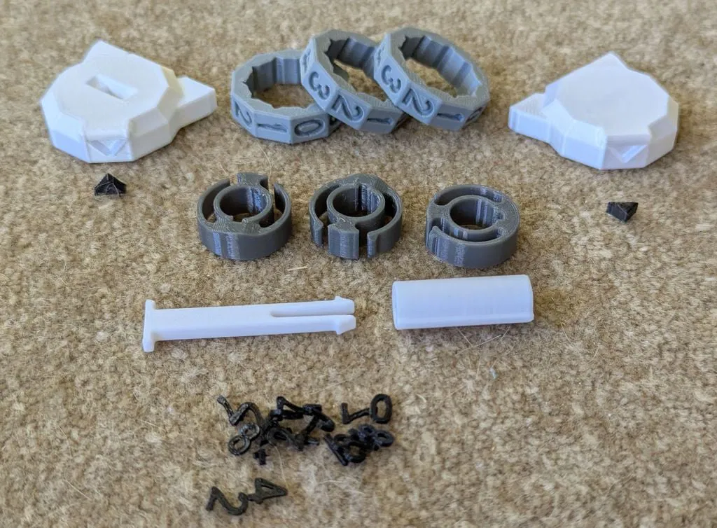 Mình in mẫu gốc bị vài lỗi nên làm lại hầu hết chi tiết, chỉ giữ ring & numbers (không kèm). Các part tương thích mẫu gốc, dung sai chỉnh nhẹ, spring mới cứng hơn (khuyến nghị PETG), có STEP và file Orca Slicer 3mf.