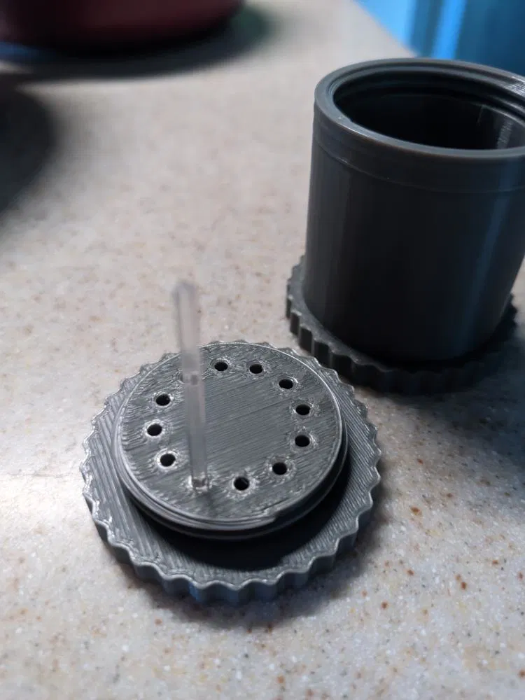 Hộp dạng vặn vít để chứa 12 thanh rotorod kích thước 1.59×1.59×32mm. Dùng để cất thanh đã bôi mỡ hoặc vận chuyển mẫu từ bộ thu về kính hiển vi. In dễ, không cần supports; lưu ý PLA dễ chảy trong xe nóng.