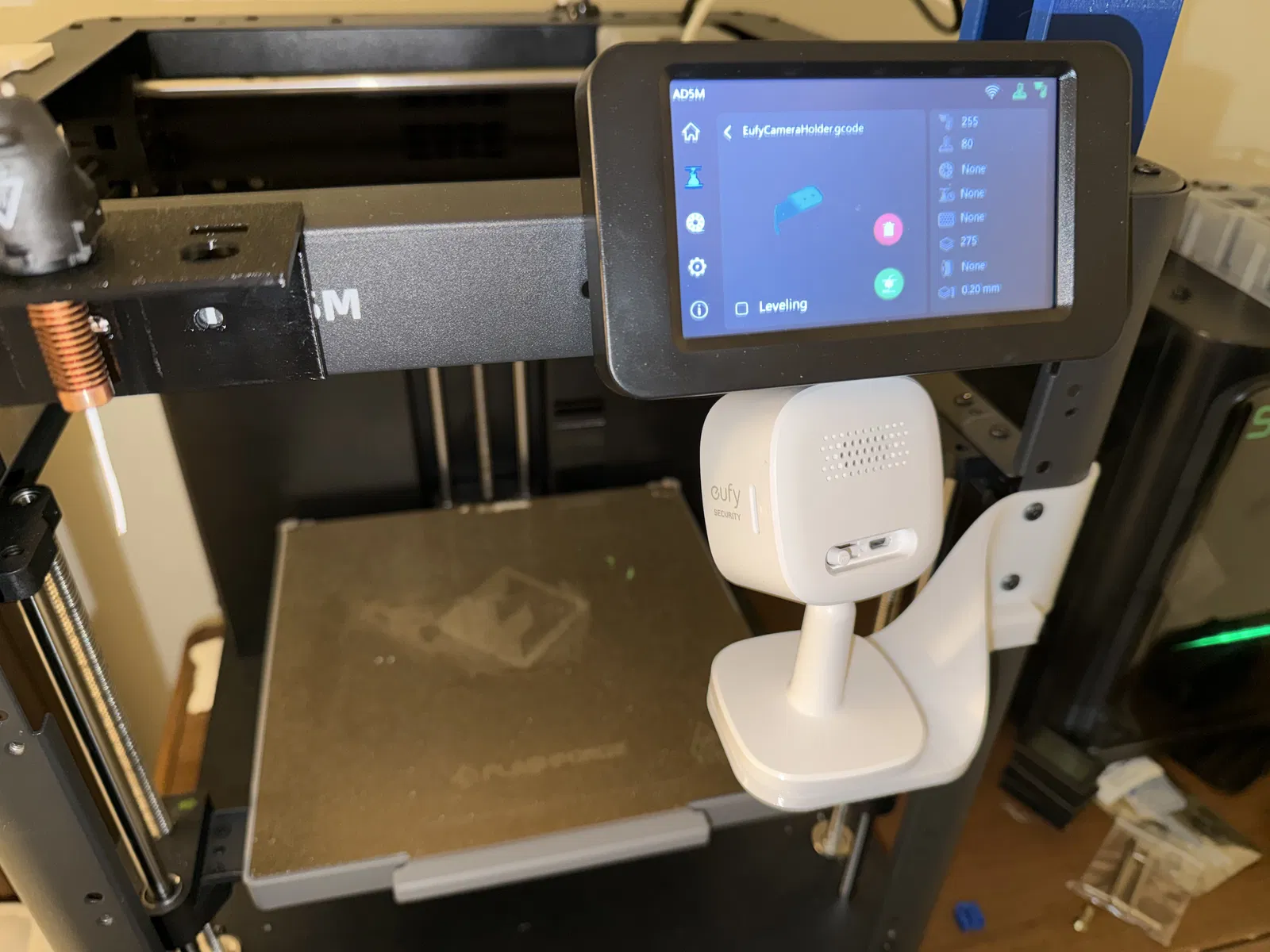 Mẫu giá đỡ cho Eufy Indoor Cam 2K (T8400X) gắn trên Flashforge Adventurer 5M (AD5M), thiết kế không có enclosure. In 3D dễ dàng, không cần supports, phù hợp để lắp camera quan sát khi máy đang chạy.