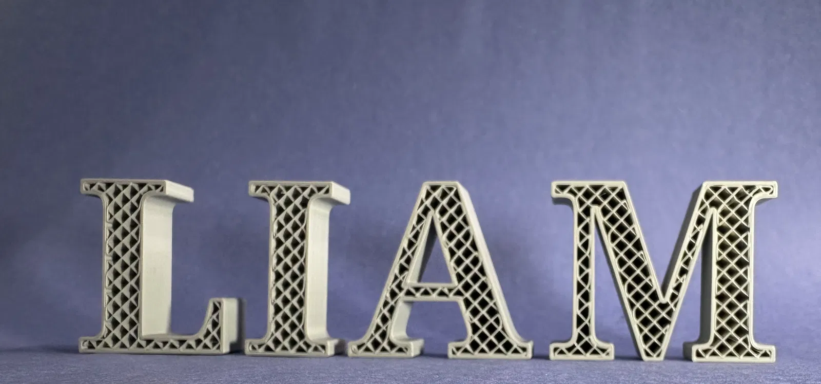 Bảng tên “Liam” dạng chữ open-top để lộ infill, nhìn kỹ thuật mà vẫn nhẹ và in nhanh. Không cần supports, hợp PLA. Trên Bambu Lab A1 chỉ khoảng 41:24 và tốn 18.48g filament cho 1 màu.