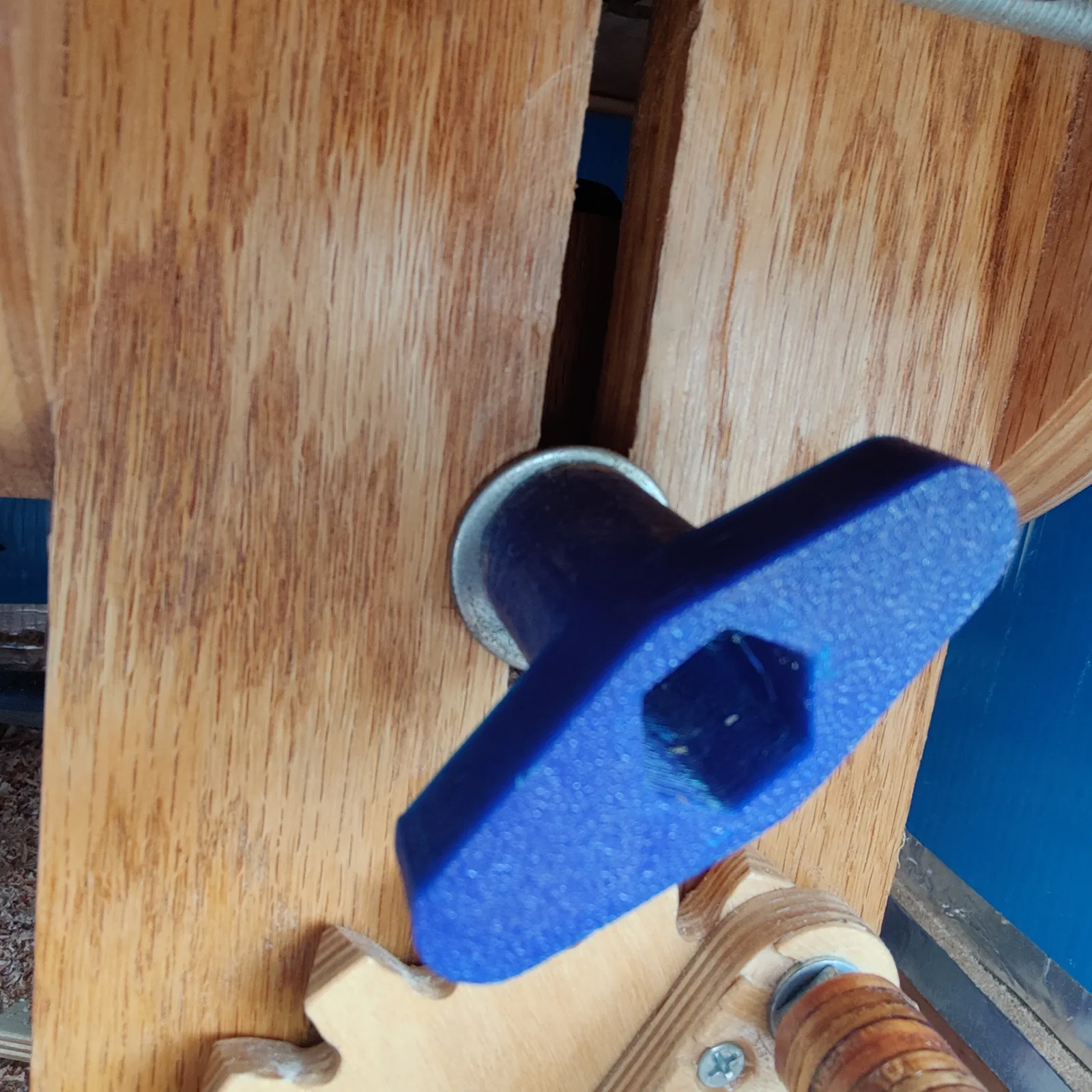 Mẫu núm vặn thiết kế để gắn vừa đai ốc lục giác 1/2 inch hoặc coupler nut. Có thể lắp bằng cách hơ nóng đai ốc để ép chảy vào, hoặc scale nhẹ để interference fit và dán keo CA. Có bản cập nhật 19mm/3/4".