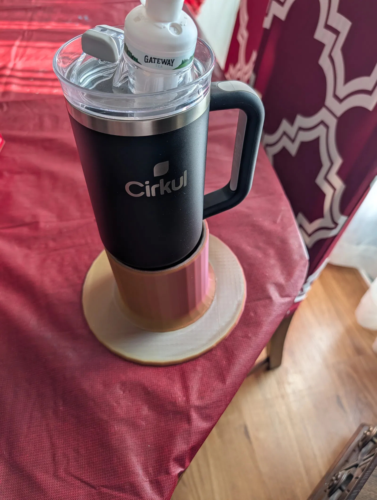 Giá đỡ tumbler (tumble holder) có đế rộng, gắn lên xe đẩy di động hoặc hộp dụng cụ để tạo bệ vững, hạn chế rung lắc và giúp ly đứng ổn định khi đang di chuyển.