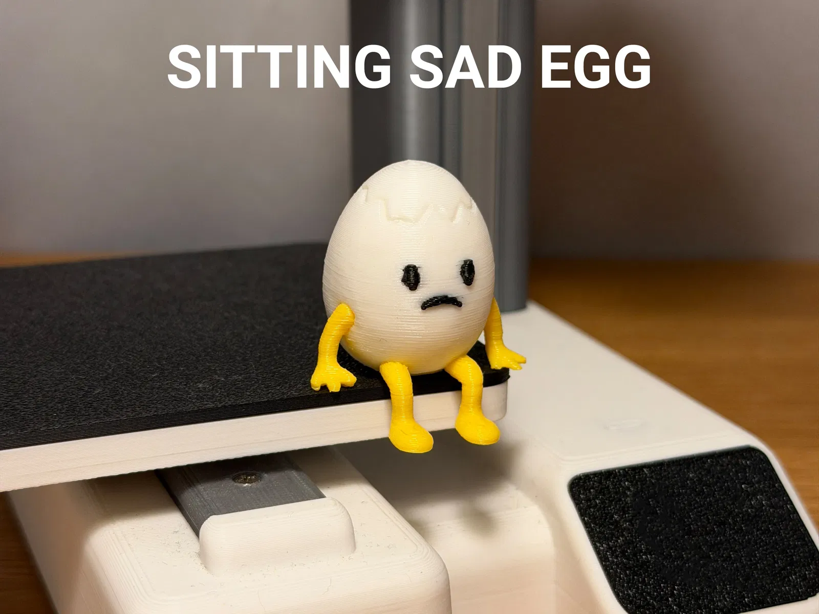 Một mô hình trứng nhỏ xíu đang ngồi buồn, có tay chân tí hon, ngồi im lặng và trông thảm hại vì vỏ bị nứt. Biểu cảm buồn rầu kết hợp với hình dáng quả trứng đơn giản tạo cảm giác vừa mỉa mai hài hước, vừa “đúng tâm trạng” kỳ lạ.
