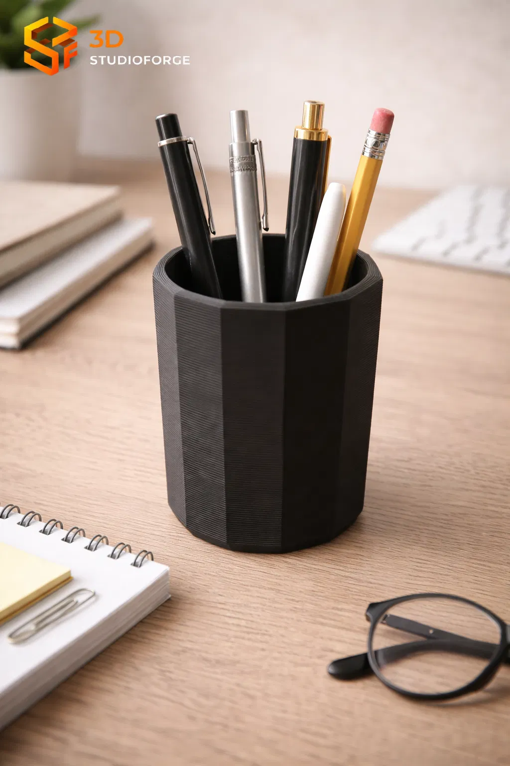 Mẫu ống đựng bút chì phong cách hiện đại, thiết kế gọn gàng và tối giản, phù hợp đặt trên bàn học hoặc bàn làm việc. Giúp sắp xếp bút chì ngăn nắp, nhìn sạch sẽ và tiện dụng.