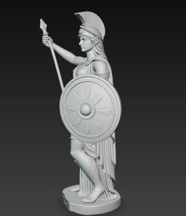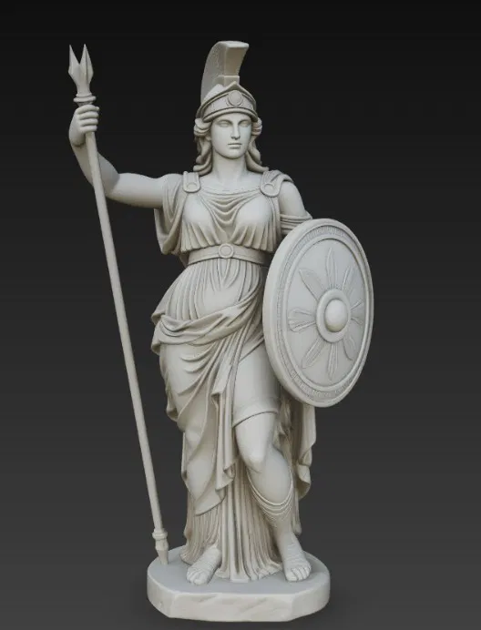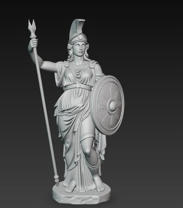 Mẫu tượng Athena, nữ thần trí tuệ trong thần thoại Hy Lạp, được thể hiện với cây giáo và chiếc khiên đầy uy nghi. Phù hợp để in 3D làm tượng trưng bày, mô hình sưu tầm hoặc trang trí bàn làm việc.
