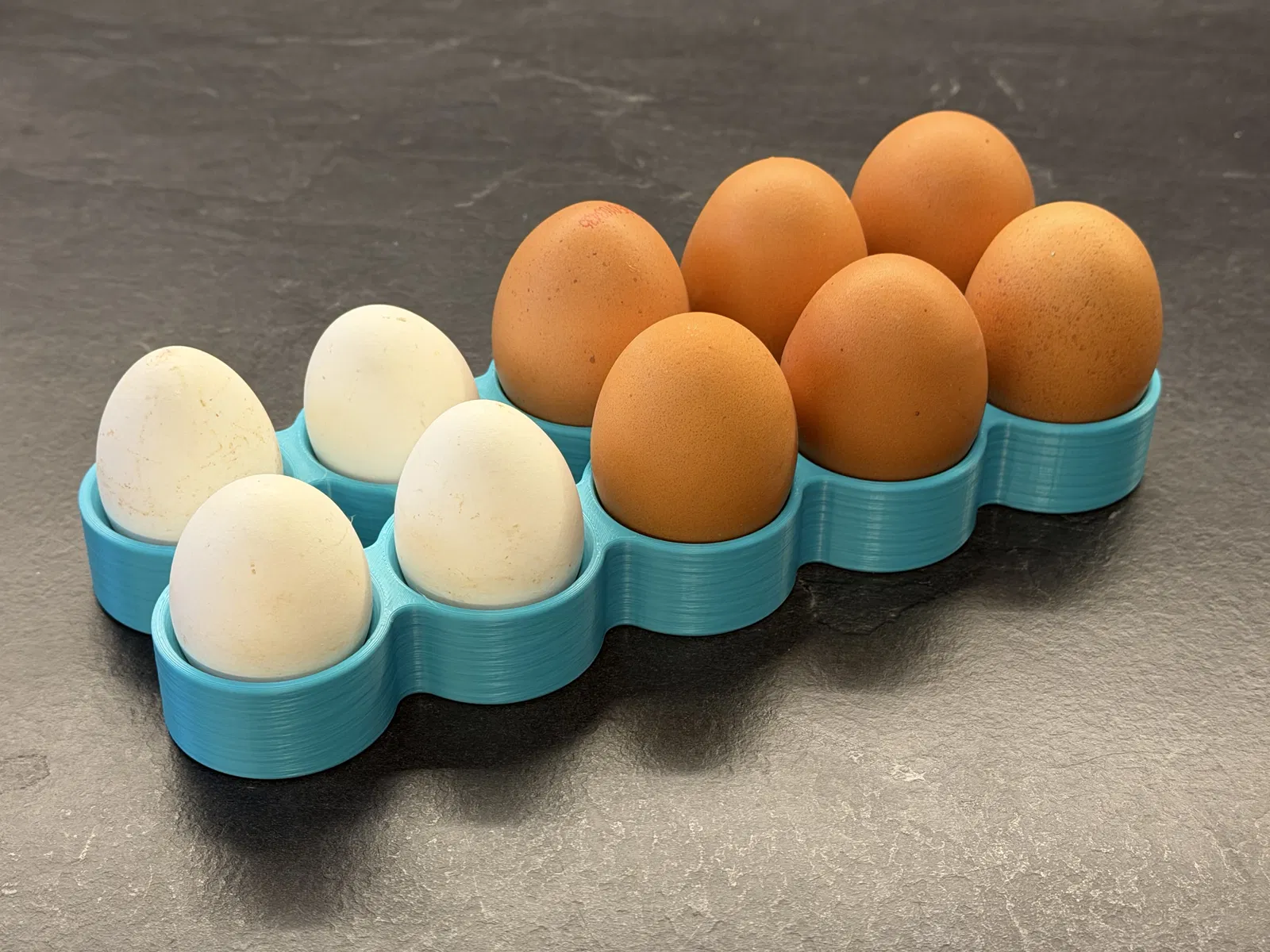 Khay đựng trứng phiên bản mịn (smooth) phù hợp mọi kích cỡ từ S đến XXL (tối đa 50mm đường kính). Có tùy chọn 4/6/8/10/12 trứng. In không cần support hay brim, tiện để tủ lạnh.