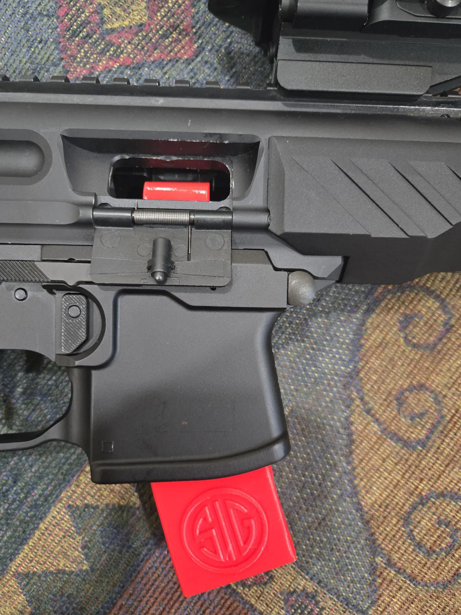 Cái safety này gài vô giống hệt một băng đạn bình thường, và chỉ nhả ra khi bấm magazine release. Phần trên mình cũng kéo dài đủ để khối chặn nhìn thấy được qua ejection port, để người khác nhìn vào là biết nó đang được lắp đúng chỗ.