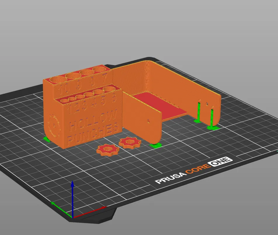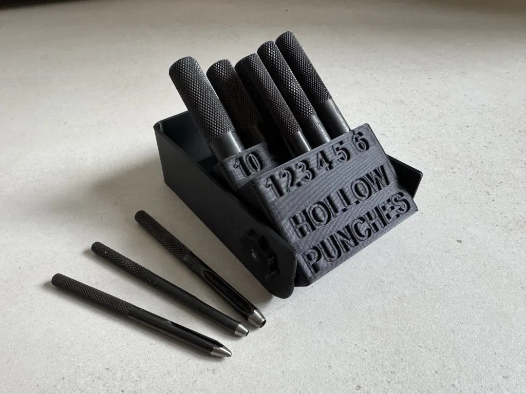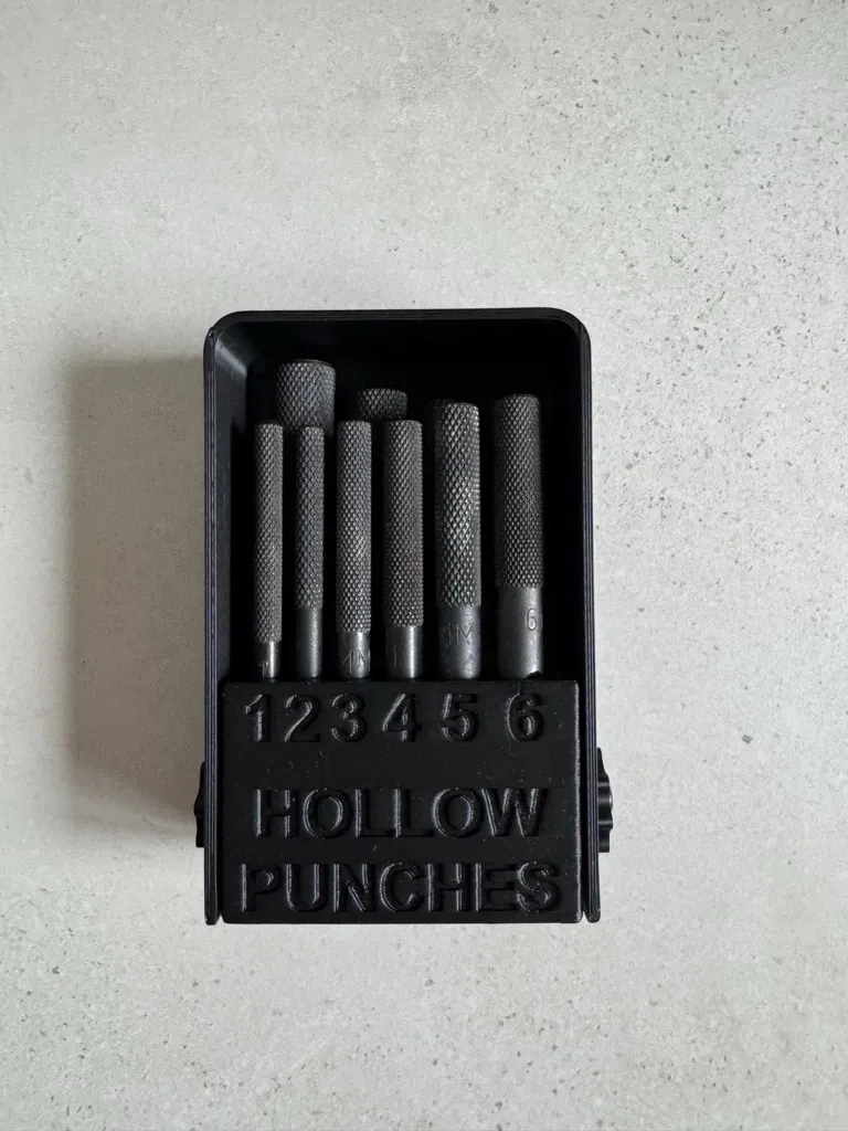 Hộp đựng cho 10 vật hình trụ như bộ đục lỗ. Nắp có thể mở và bấm khớp chắc chắn ở nhiều vị trí. Thiết kế gồm đế, nắp và 2 vít; dùng thanh ren M3 75 mm và 2 ê-cu tự hãm M3.