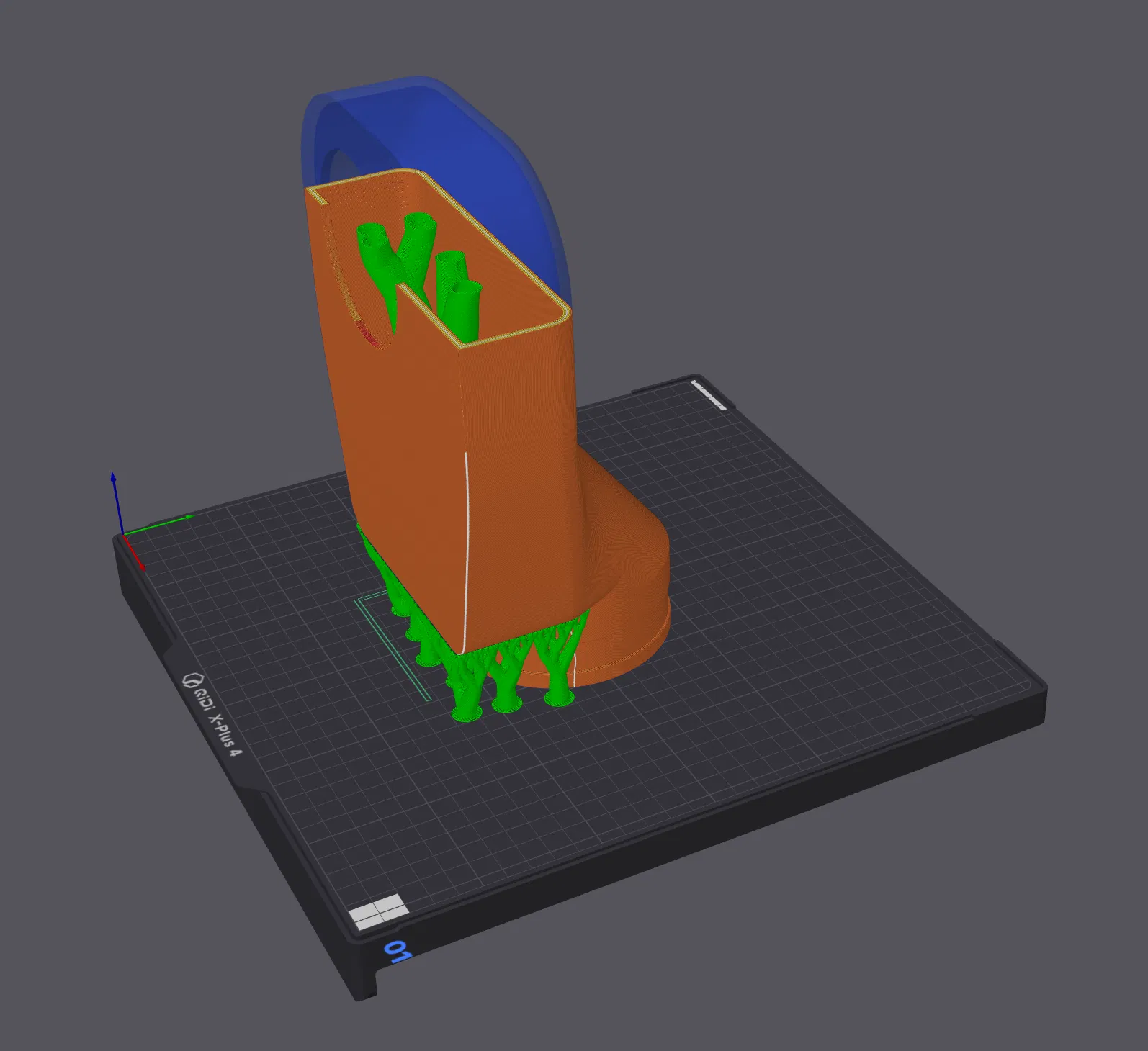 In với Tree/Auto supports và đặt hướng đúng như trong hình. Mình in bằng QIDI PET-CF và nozzle 0.6. Lưu ý: nhớ đảm bảo filament PET-CF phải khô — độ ẩm ảnh hưởng chất lượng in rất nhiều. Nếu bạn dùng vật liệu khác, nhớ chọn loại chịu được nhiệt từ quạt xả (exhaust fan). Mình cũng khuyên dùng filament Carbon Fiber hoặc Glass Fiber để kích thước ổn định hơn.