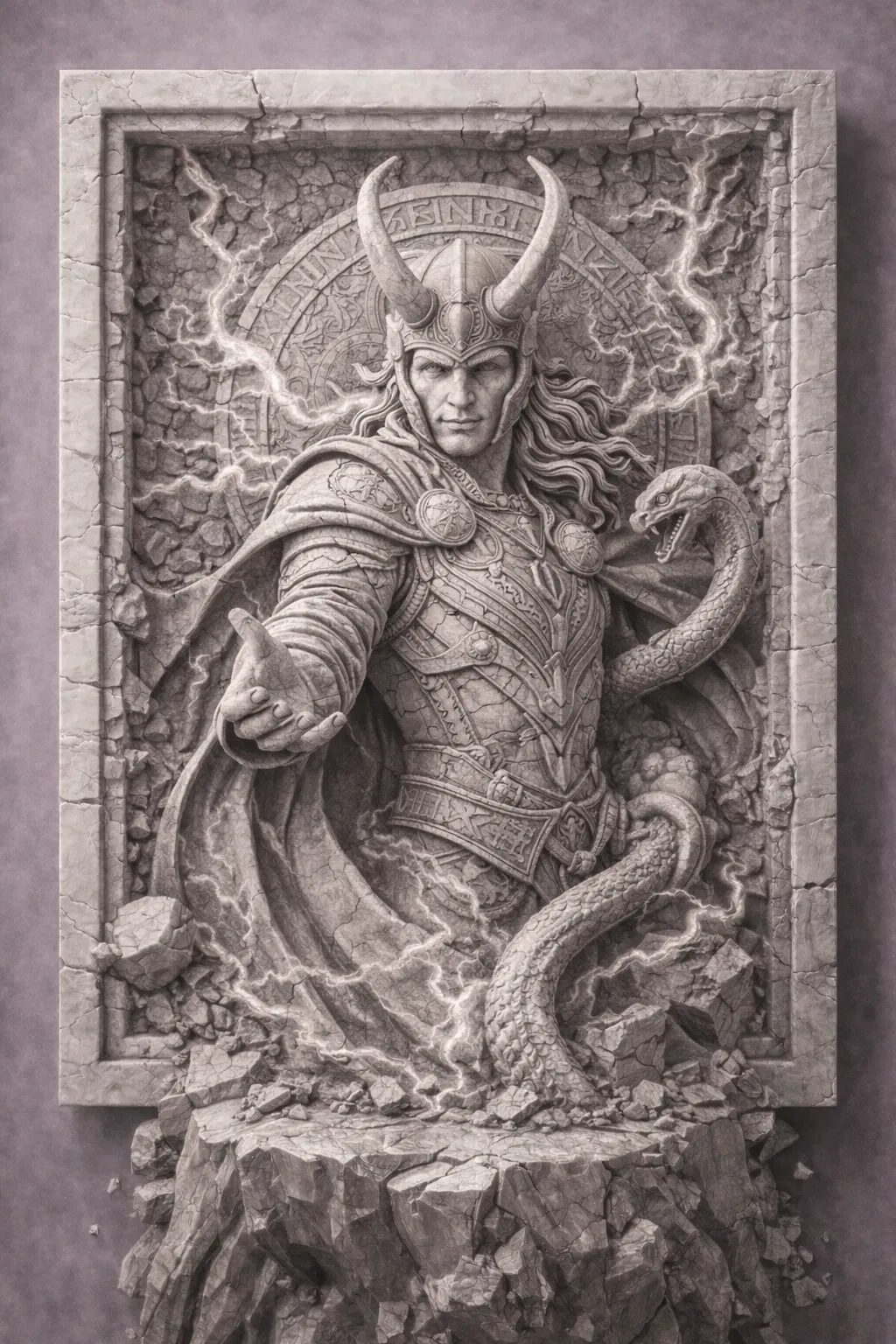 Tác phẩm điêu khắc này tái hiện Loki, vị thần lừa lọc đầy bí ẩn trong thần thoại Bắc Âu. Nổi tiếng với trí thông minh, tính khó lường và khả năng biến hoá bậc thầy, Loki được khắc hoạ ở đây dưới dạng phù điêu đá (bas-relief) đầy kịch tính, thiết kế để tạo chiều sâu thị giác mạnh và in 3D gọn, sạch.