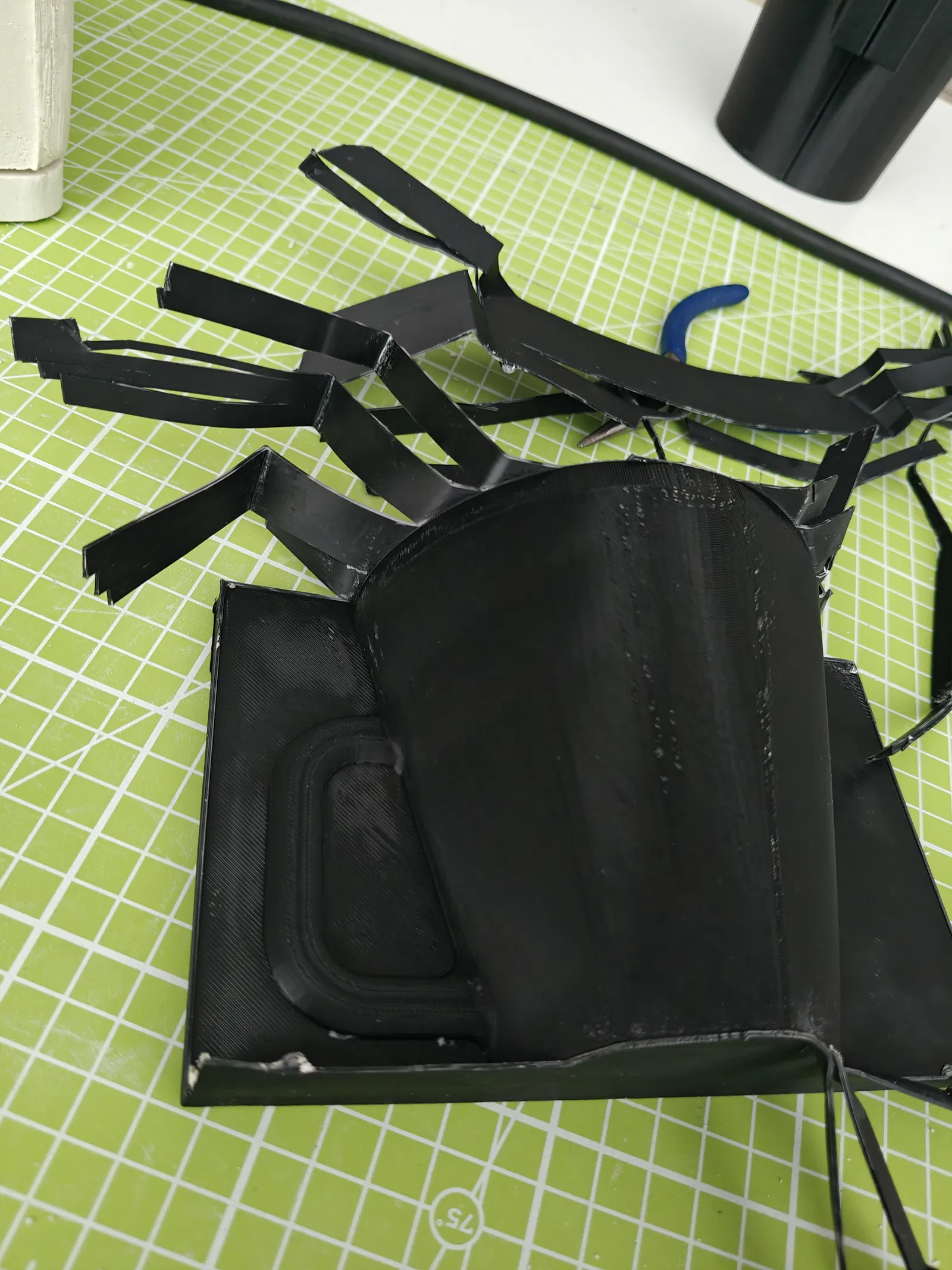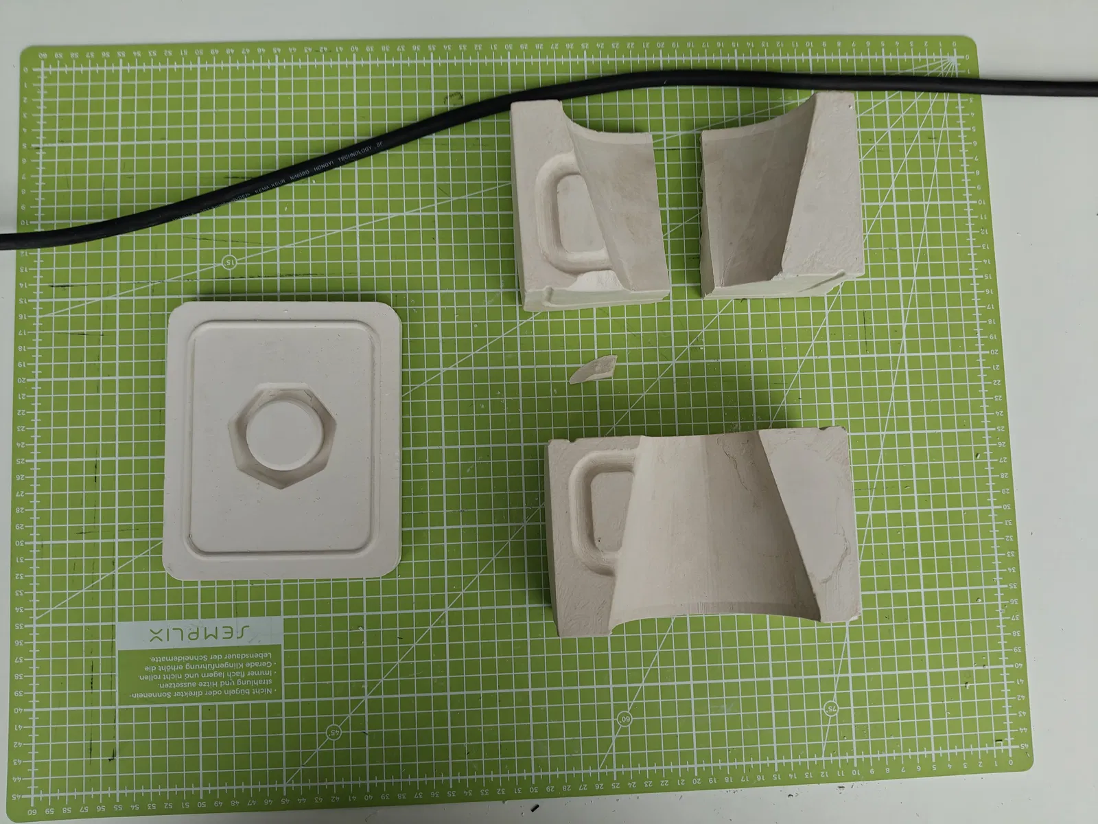 Để gỡ PLA ra khỏi khuôn thạch cao, mình đã thử gia nhiệt phần nhựa rồi dùng kìm bóc ra. Trong quá trình này, một số phần của khuôn bị bể, nhưng mình vẫn dùng được. Do co ngót và hư hại nhẹ, chiếc cốc cuối cùng nhỏ hơn khoảng 40% so với model ban đầu.
