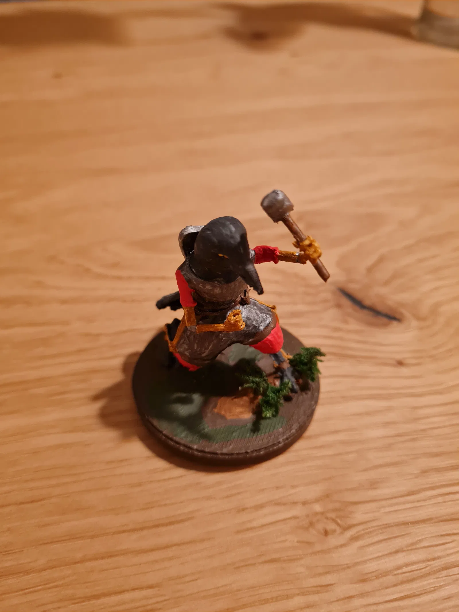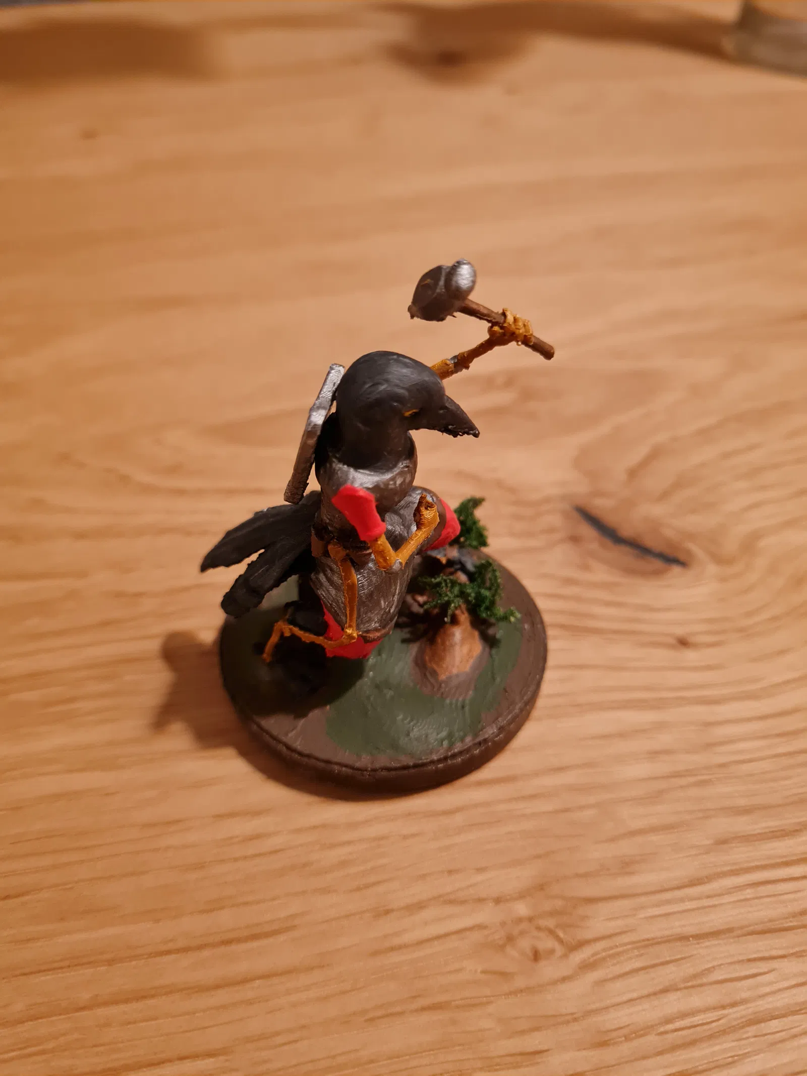 Mô hình Kenku (quạ hình người) Artificer/Fighter/Paladin dùng cho Dungeons and Dragons và các TTRPG tương tự. Có kèm file STL và gcode; hình minh hoạ là bản mình sơn, thêm rêu làm foliage.