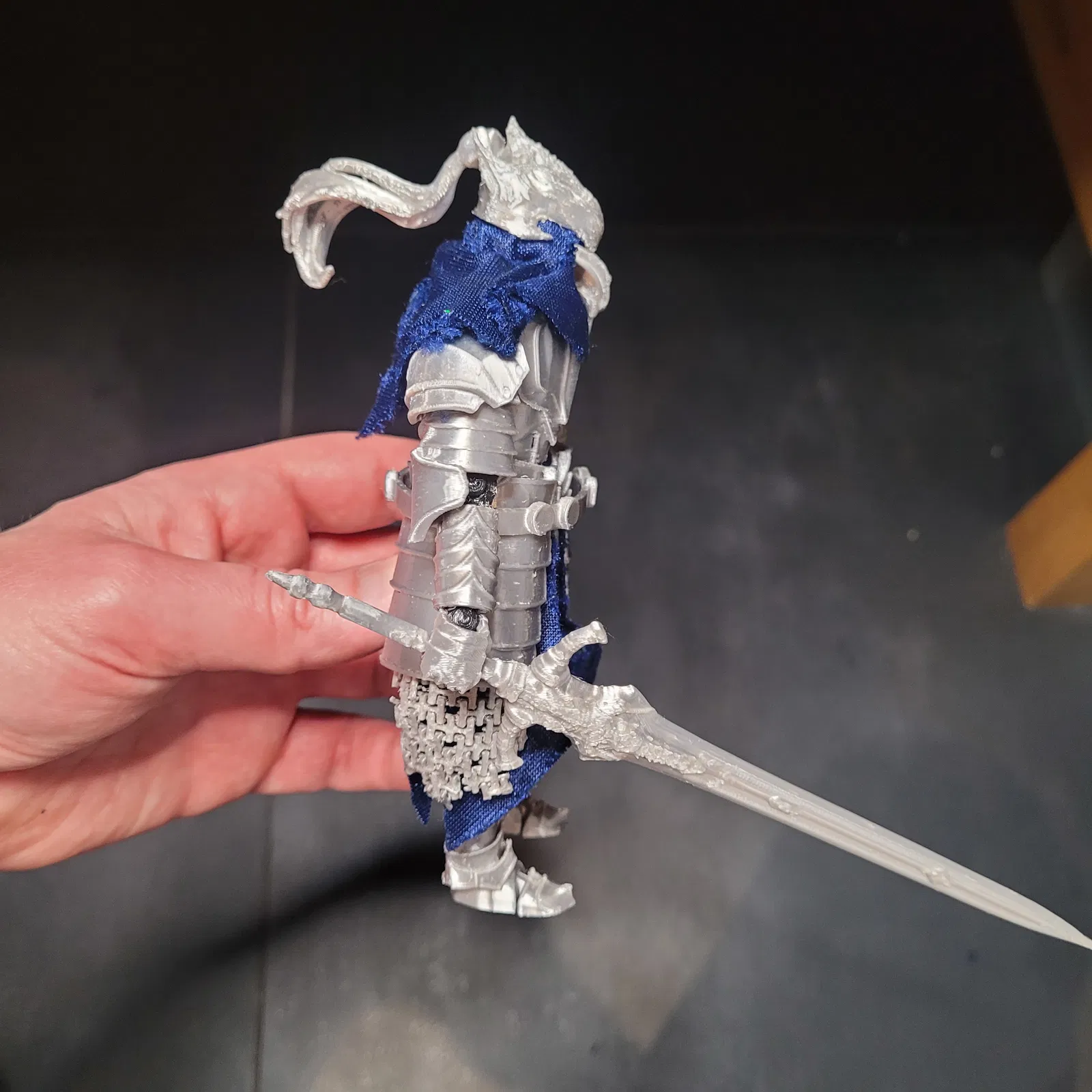 Bộ giáp có thể hơi khó in. Nếu có gì bị lỗi, bạn có thể thử xoay lại hướng đặt chi tiết và/hoặc tăng support angle treshold. Như trong hình, mình dùng vải để làm bản remix này nhìn giống Knight Artorias trong game hơn. Bạn có thể dùng hình để tham khảo hoặc tự do sáng tạo theo ý mình. Bạn cũng có thể cắt chainmail cho phần tassets theo ý để tạo hiệu ứng hư hại. Bạn sẽ cần dán một miếng chainmail nhỏ ở phía sau phần giáp eo.