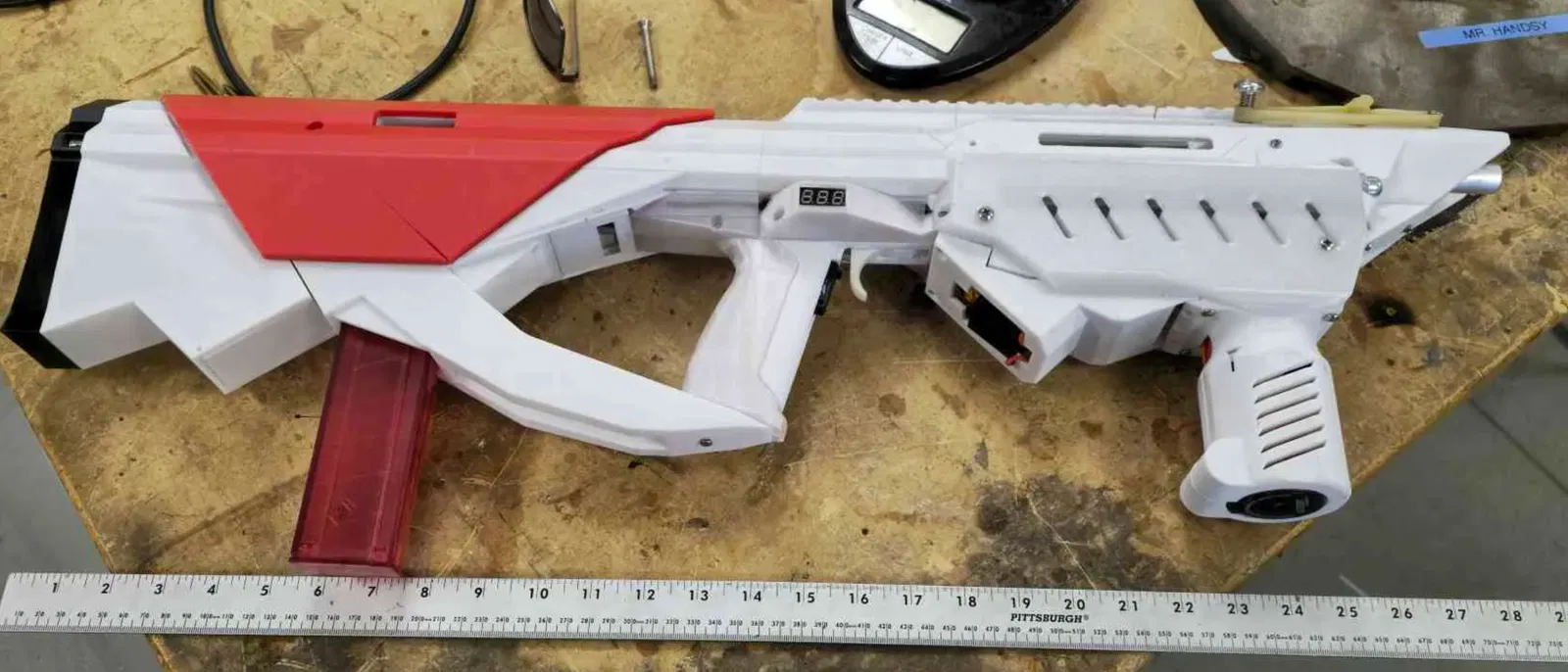 Ban đầu dựa trên nền tảng Lynx, cây blaster đã được chỉnh sửa rất nhiều này là AEB open bolt, truyền động bằng xích (chain driven). Máy dùng motor brushless size 550 và tùy theo gearbox (21:1 hoặc 51:1) có thể đạt 280 fps ở 16 dps hoặc 330 fps ở 8 dps. Nó dùng pin Lipo 3s 5200 mah, có coupler nhôm gia công (machined aluminum) và nhông xích thép cắt laser (laser cut steel sprockets). Chu trình cycling cũng đã được tinh chỉnh để cấp đạn ổn định với dart bị mòn khi dùng talon thường.