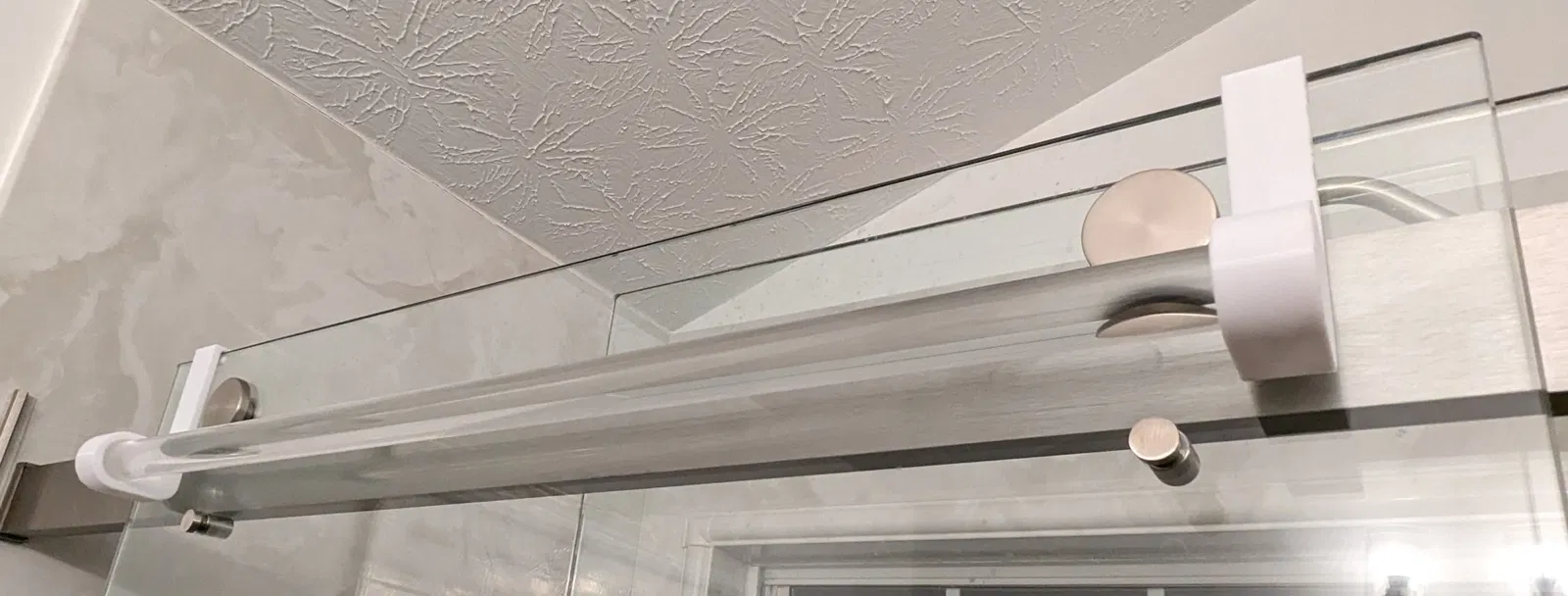 Kết thúc giá treo khăn được làm để treo trên đỉnh cửa tắm bằng kính và giữ một thanh acrylic đường kính 1 inch.