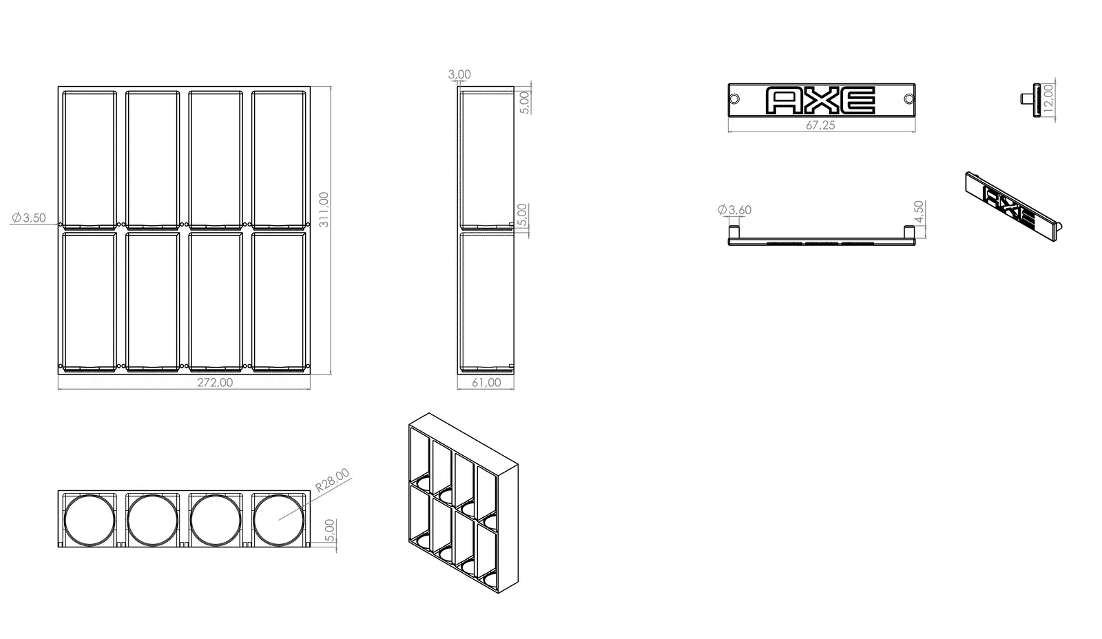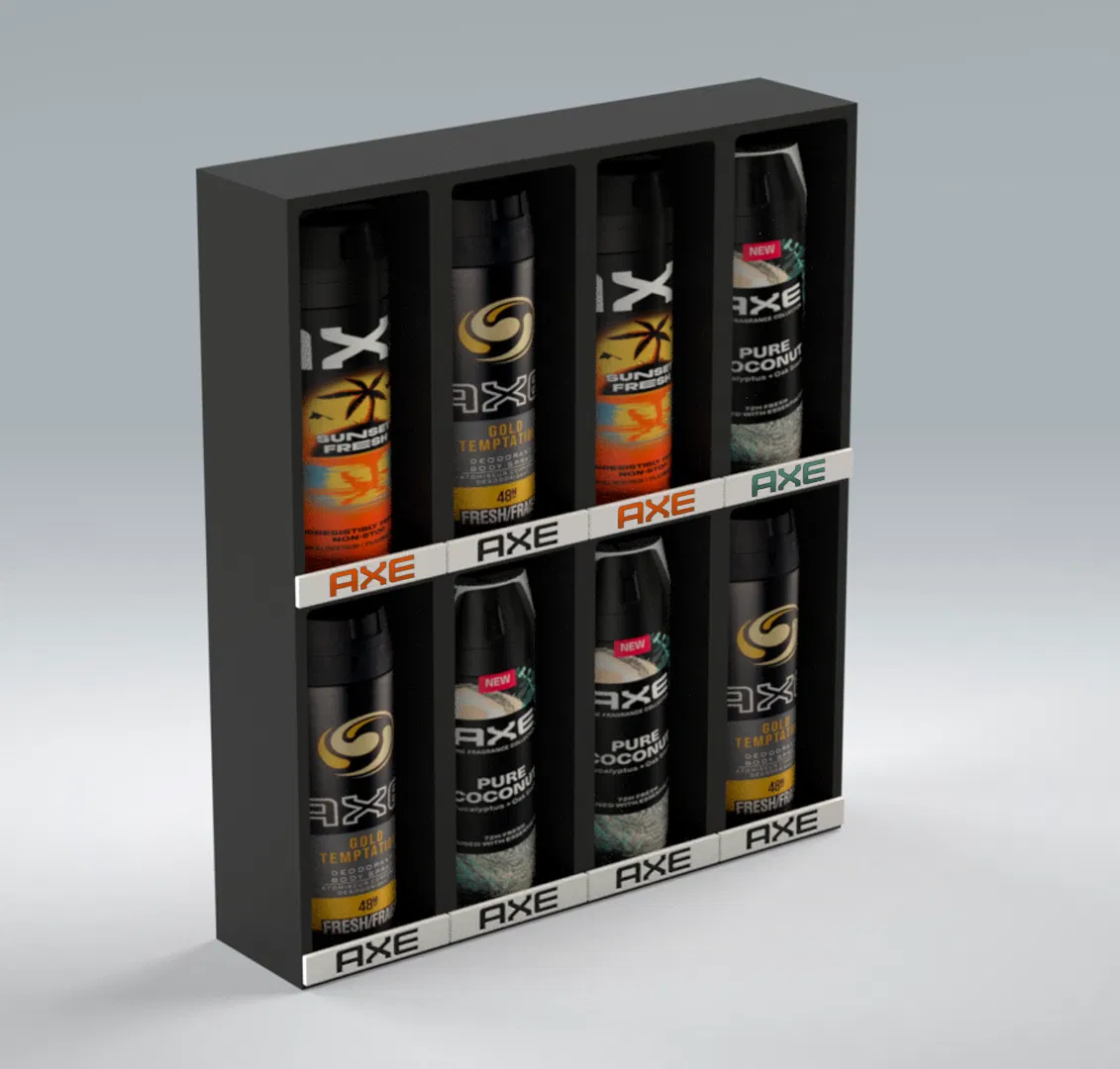 Mẫu kệ trưng bày dành cho bộ sưu tập AXE Deodorant, giúp sắp xếp gọn gàng và để các chai khử mùi AXE đứng chắc chắn. Phù hợp để đặt trên bàn hoặc kệ, nhìn ngăn nắp và dễ lấy.